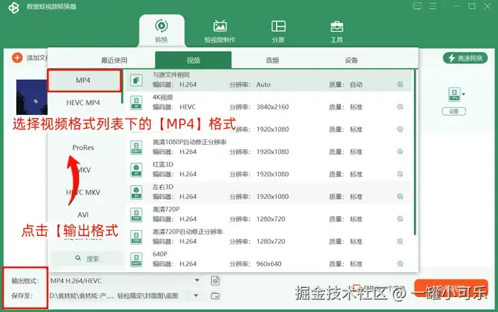步骤2:单击【输出格式】,选择视频格式列表下的【MP4】格式。