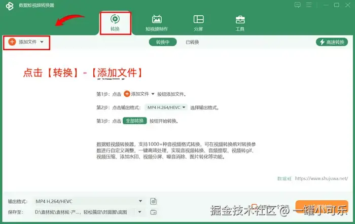 步骤1:打开数据 蛙视频转换器,点击【转换】选项,并选择【添加文件】,导入视频文件。