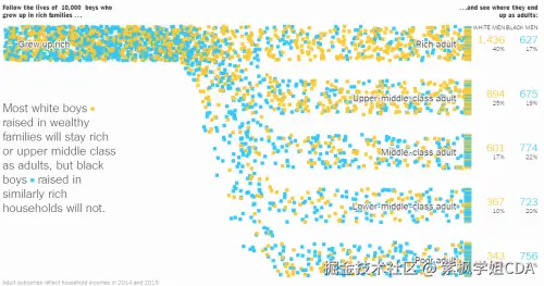 黄色方块:白人家庭,蓝色方块:黑人家庭。第一行是生于富人阶层,第二行是中上阶层,第三行是中产阶层,第四行是中下阶层,最后一行是穷人阶层。