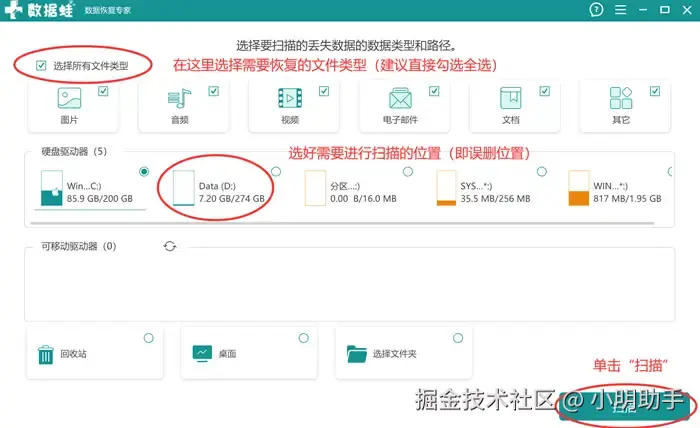 第1步: 启动该软件,在首页上选好需要恢复的文件类型和误删文件的位置进行扫描,最后操作软件开始扫描;