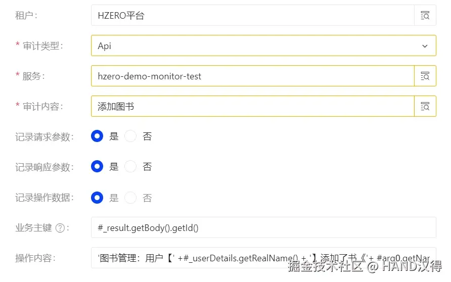 - 业务主键和操作内容使用SpEL表达式进行配置,示例中的业务主键代表取返回值中的body的id属性作为操作的主键。