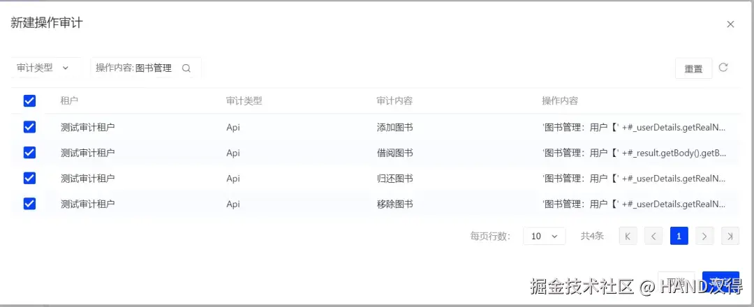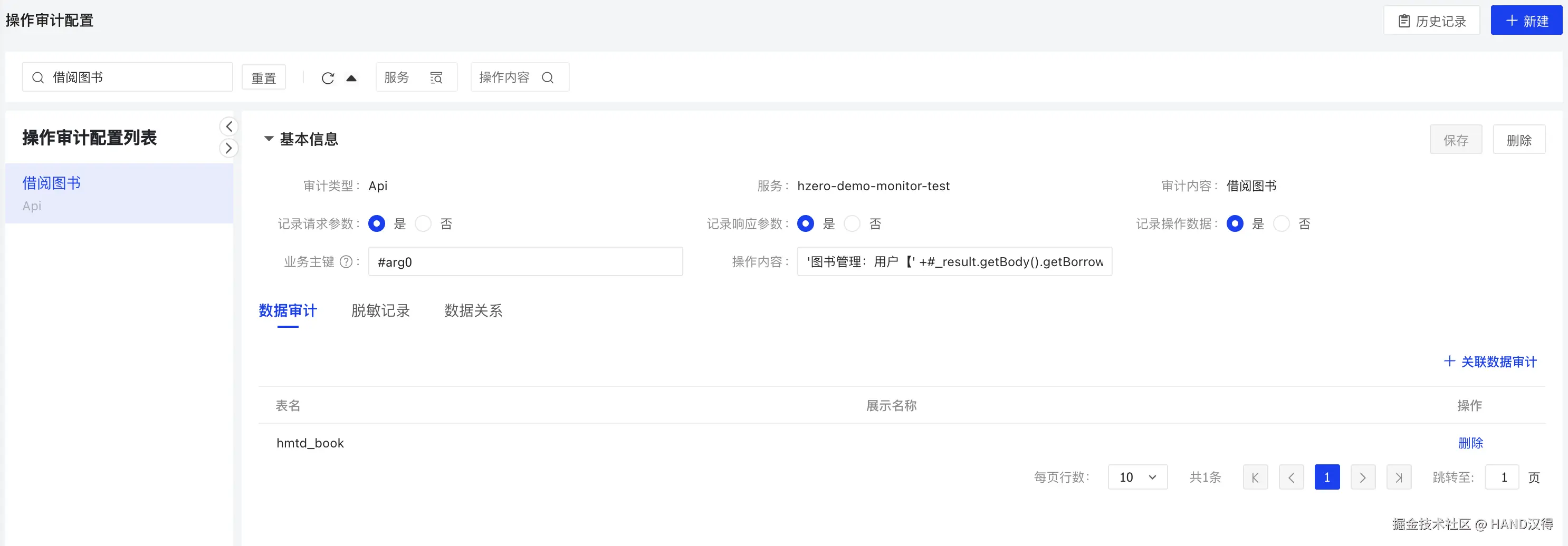 审计类型选择Api,服务选择要审计的应用服务,审计内容为对应操作的接口,这里分别选择添加图书、移除图书、归还图书、借阅图书创建四个操作审计,并添加与启用的数据审计配置的关联关系。