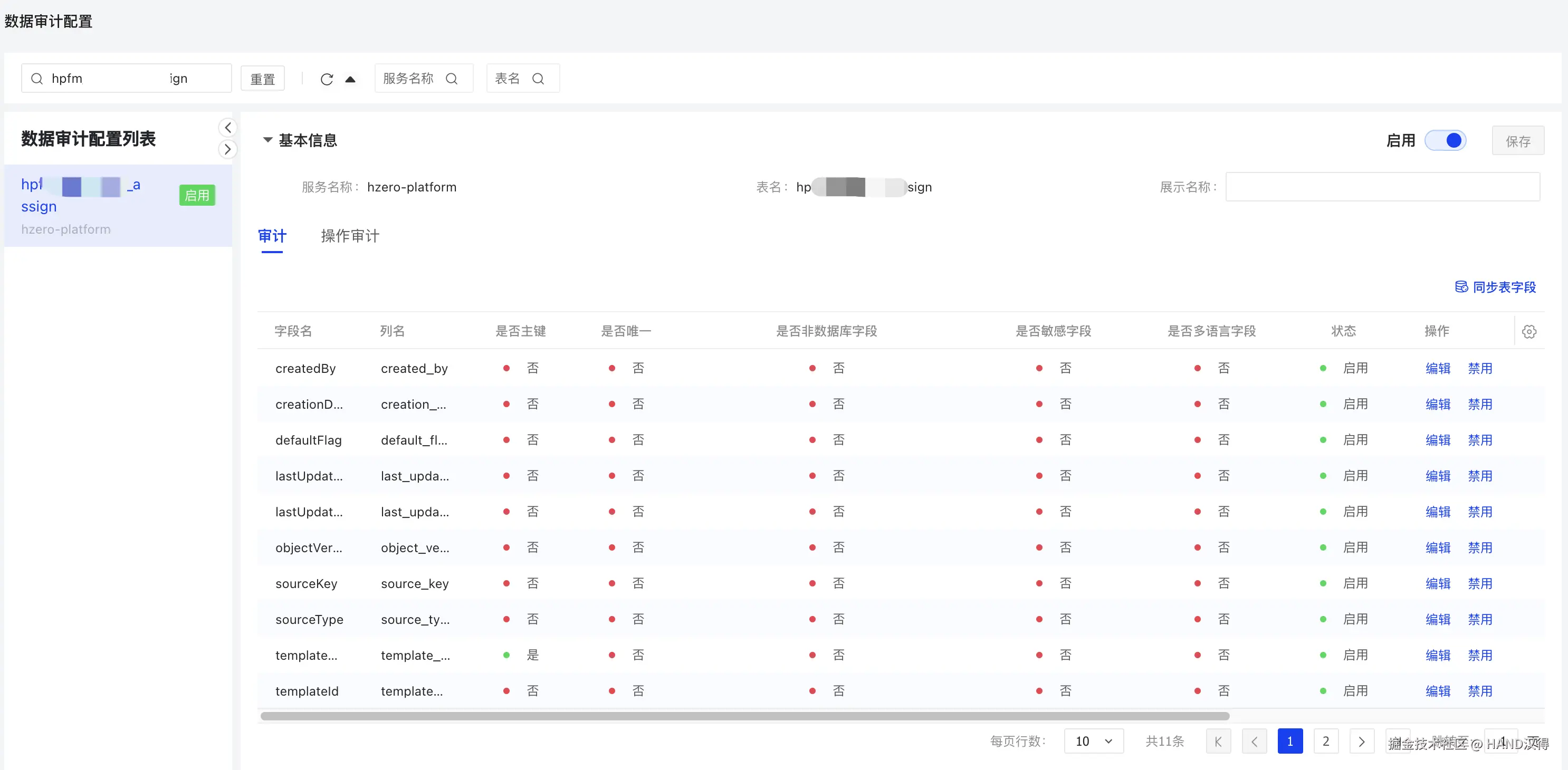 打开菜单审计管理->数据审计->数据审计配置,找到需要进行审计的表数据,点击启用。启用审计的表会在发生数据变动时记录其变化。