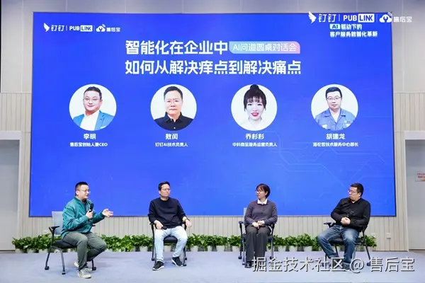 当下,个人级的AI应用有很多,企业级的AI工具也随处可见,但是不少人认为AI目前只能解决企业的痒点,想要解决真正的痛点还有距离。在“AI问道圆桌对话会”环节,售后宝创始人兼CEO李明与三位嘉宾进行了“智能化(AI)在企业中如何从解决痒点到解决痛点”的探讨。