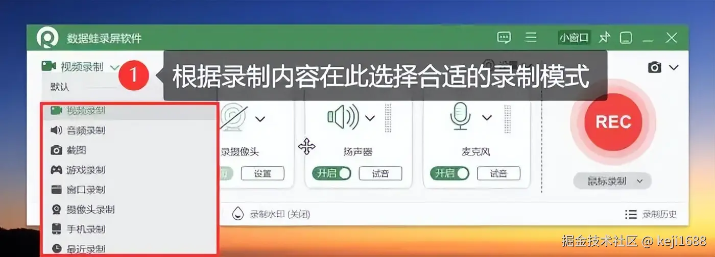 步骤1:在电脑上启动录屏软件后,在首页的左上角根据录制内容选择合适的录制模式进行录屏。