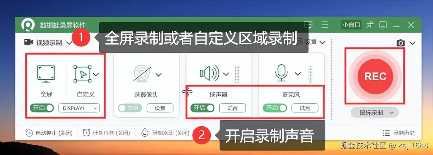 步骤2:框选合适的录制区域,并调整录制参数等,设置完成后点击 【REC】 按钮进行录屏。