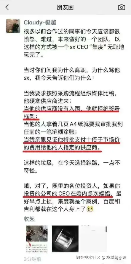 甚至还有更炸裂的消息爆出,极越前高管曾经在个人朋友圈爆料:夏一平婚内出轨,嫖娼等,这样的垃圾,在今天选择跑路,一点不奇怪!