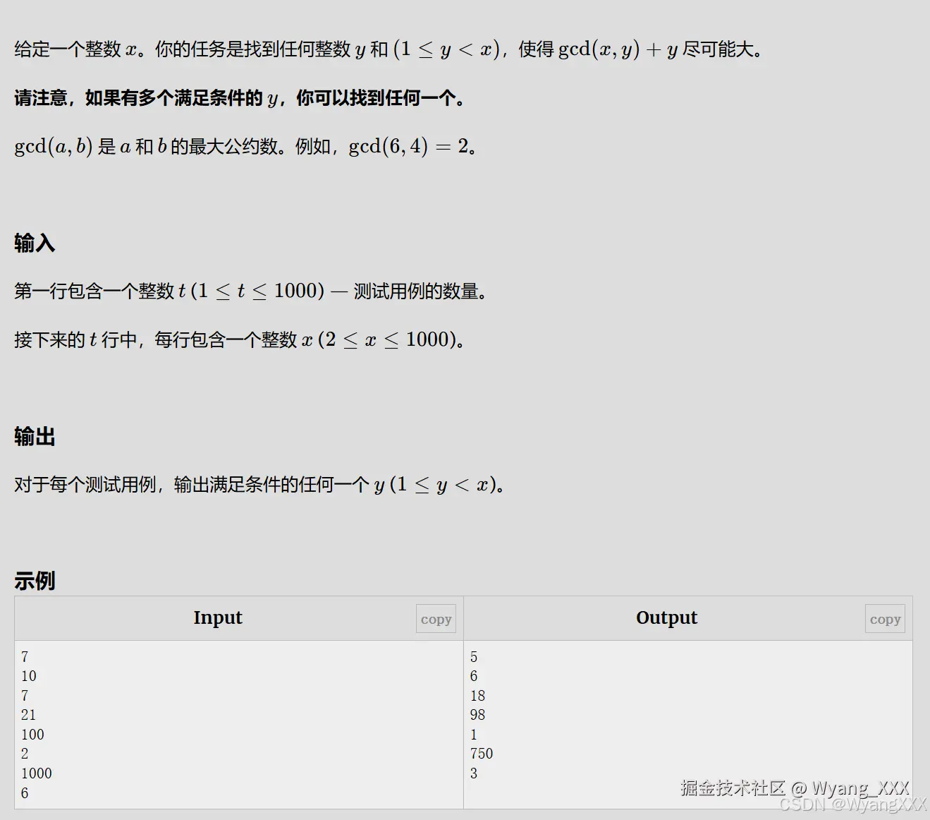 虽然题目是想让gcd(x,y)+y尽可能大,但是我们知道,gcd(x,y)才是我们关注的重心,y越大,gcd(x,y)越大,gcd(x,y)+y就越大。题目数据比较小,可以直接暴力,当然如果你想也可以尝试去优化一下。