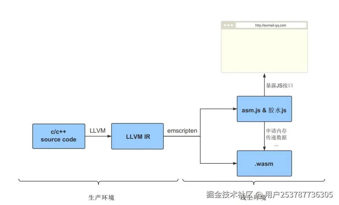 以 Emscripten 工具链为例(它是目前比较流行的将 C/C++ 源码编译为 WebAssembly 的工具链),其具体编译过程如下:
