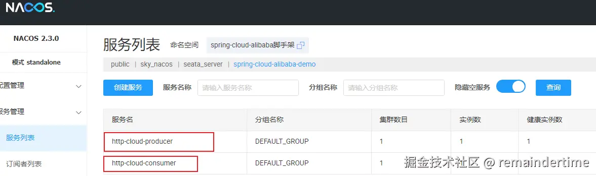 启动本地服务后,我们会发现nacos注册中心已经成功注册了消费者和生产者服务: