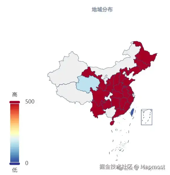 这种图表类型对于展示地理上的变化和趋势非常有用,特别是在人口、经济、环境等方面。在地区分布图中,每个地理区域通常被分配一个特定的颜色或样式,其强度或大小反映了该地区的数据值。这使观众能够一目了然地理解不同地区之间的差异,无需详细的数据分析。