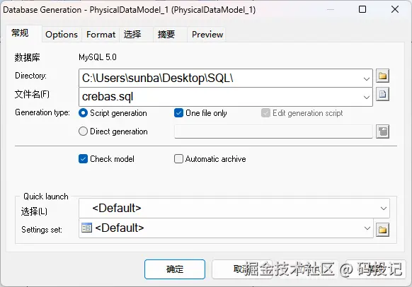 打开模型,数据库>生成数据库>确定后生成SQL,可修改保存位置,文件名等。