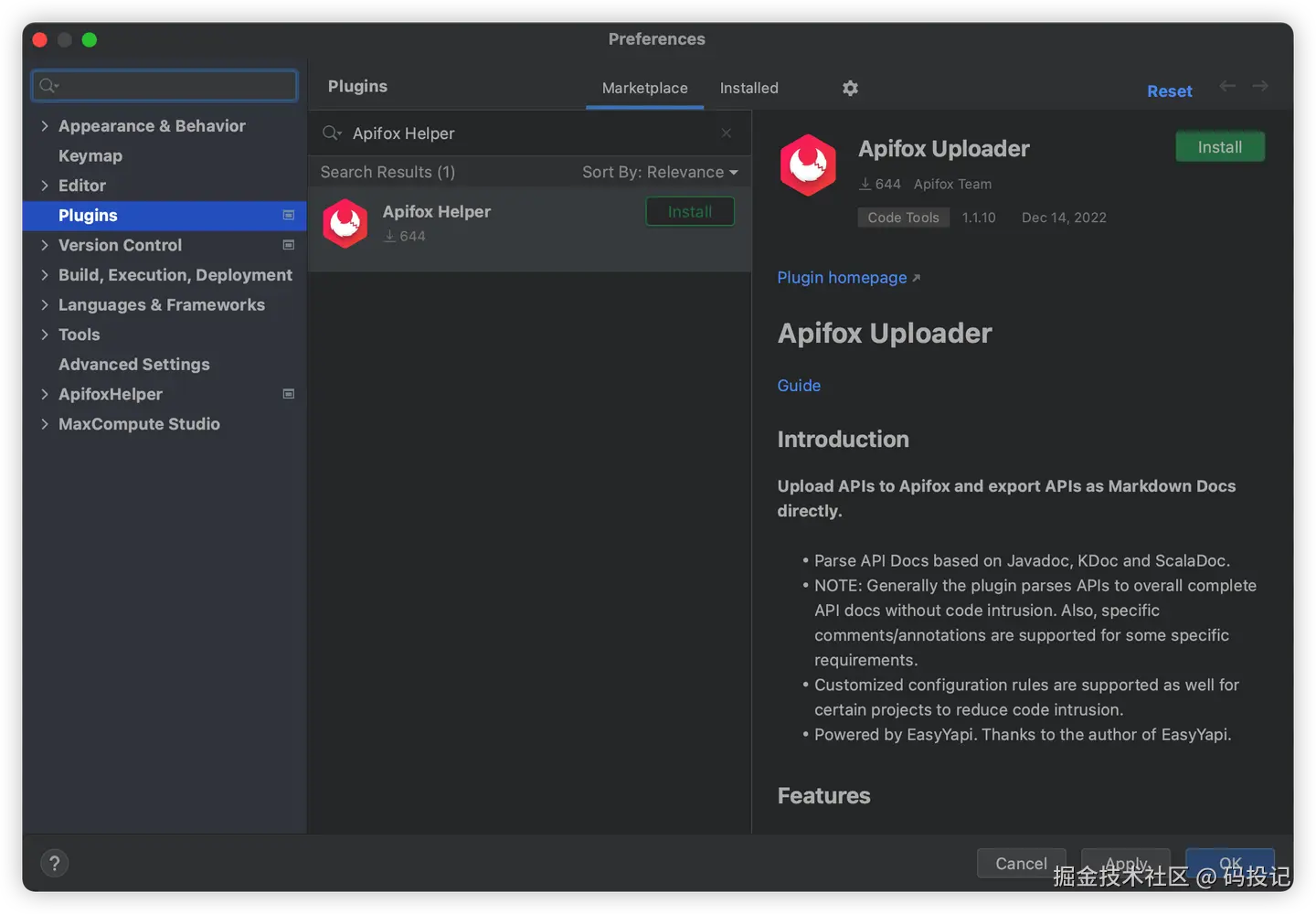 打开IDEA > File > Preferences(Settings) > Plugins,搜索 Apifox Helper。