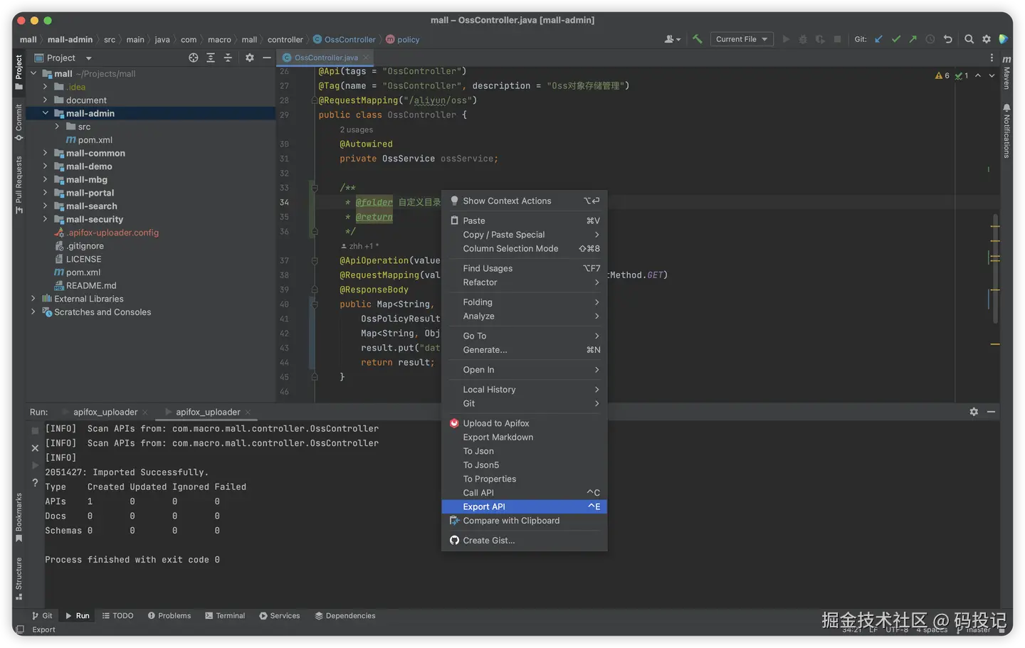 - 在模块目录上或代码编辑区域的右键菜单中选择 Export API