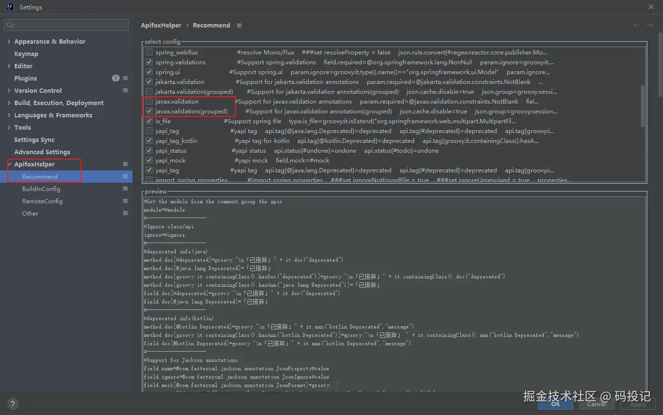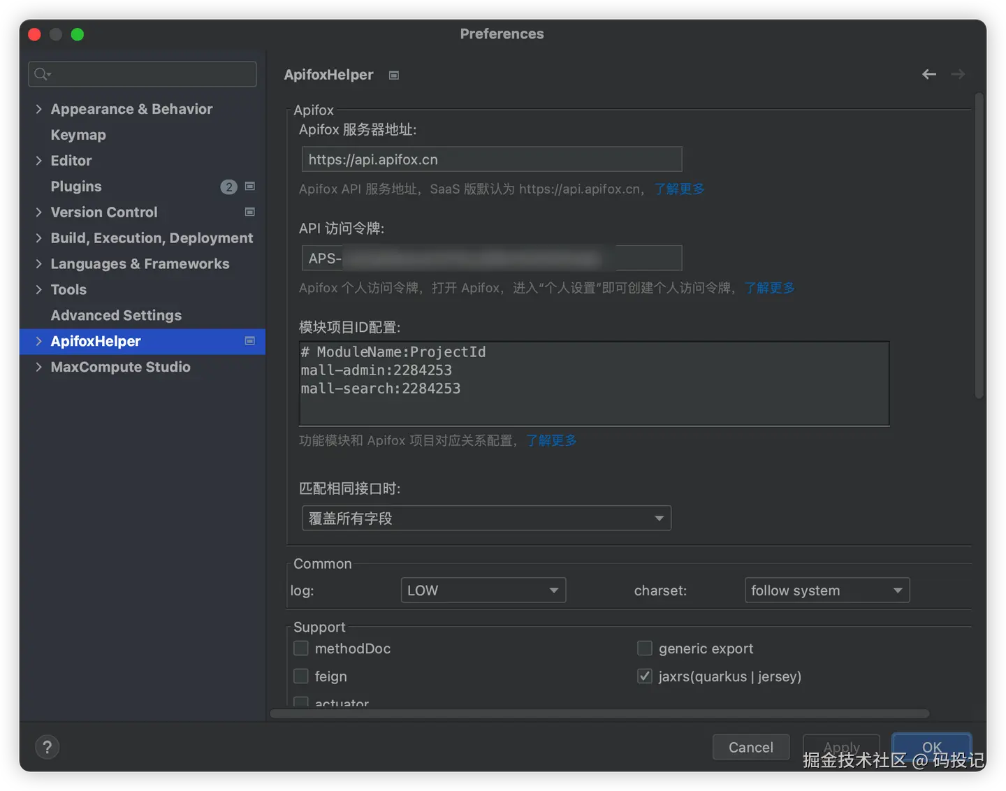 安装插件后,进入设置界面Preferences(Settings) > ApifoxHelper。