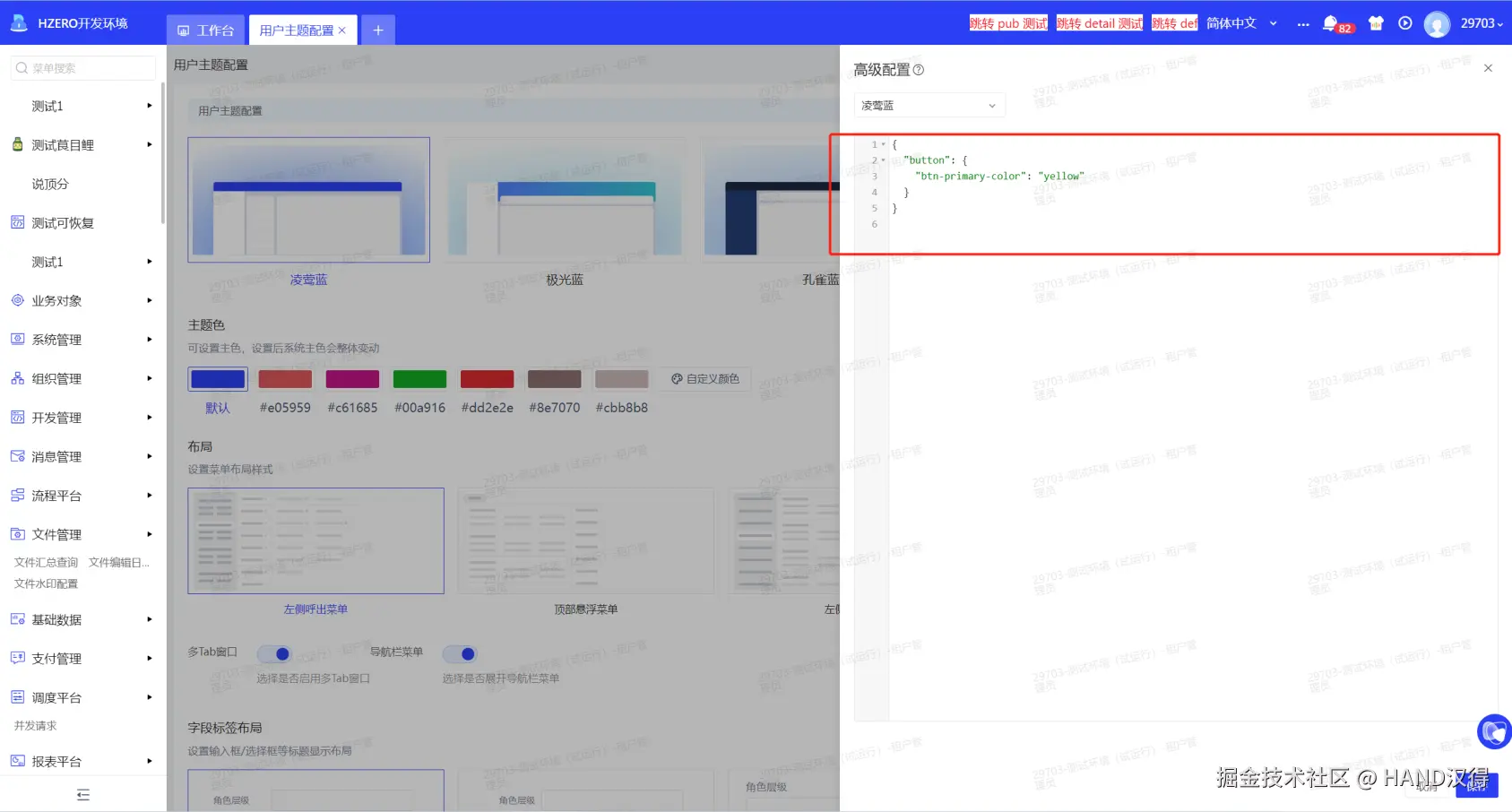 HZERO 的主题包在 v5 版本支持了 css 变量方案,利用 css 变量动态生效的特性,从而在主题界面支持了高级配置。