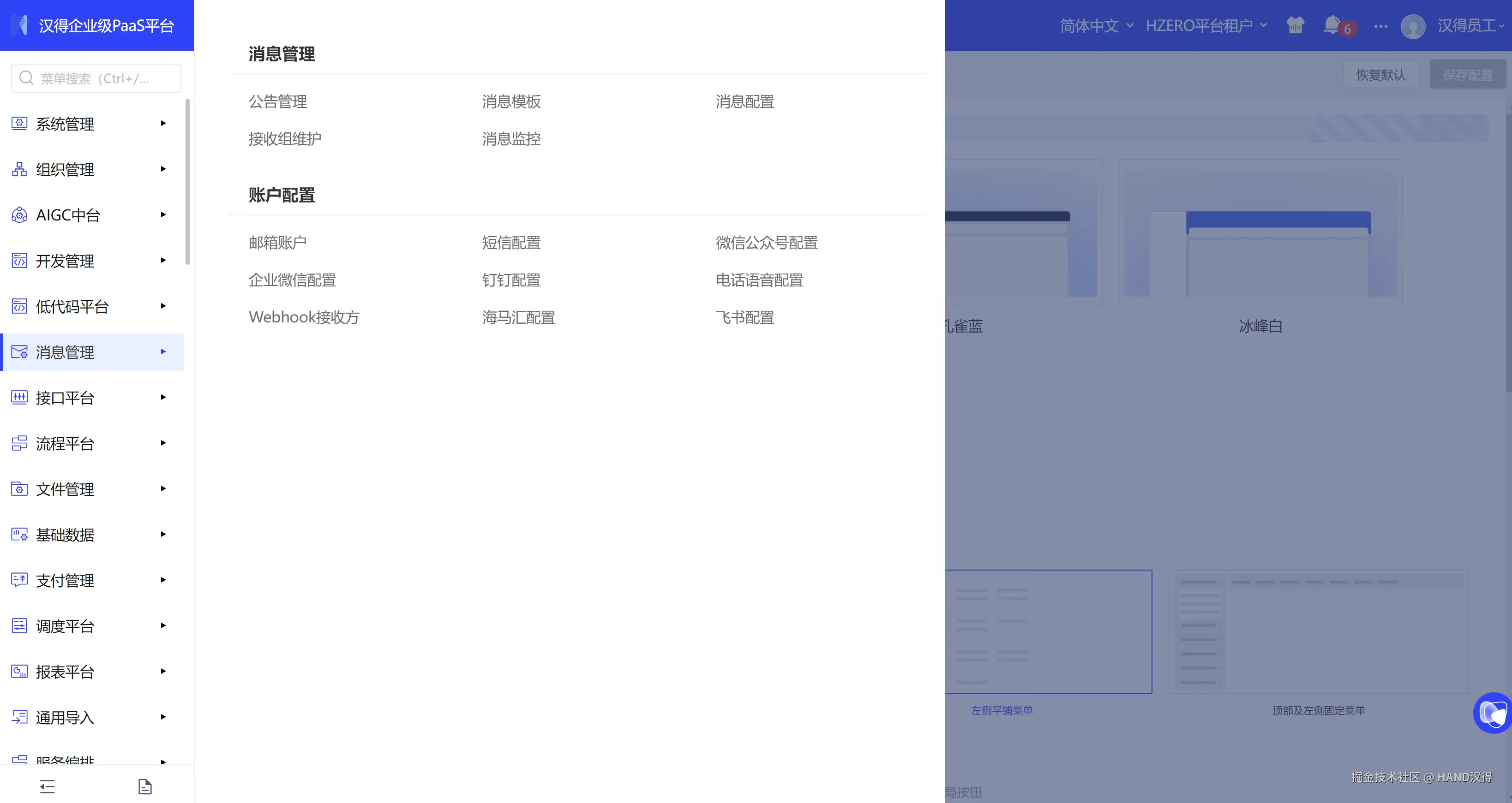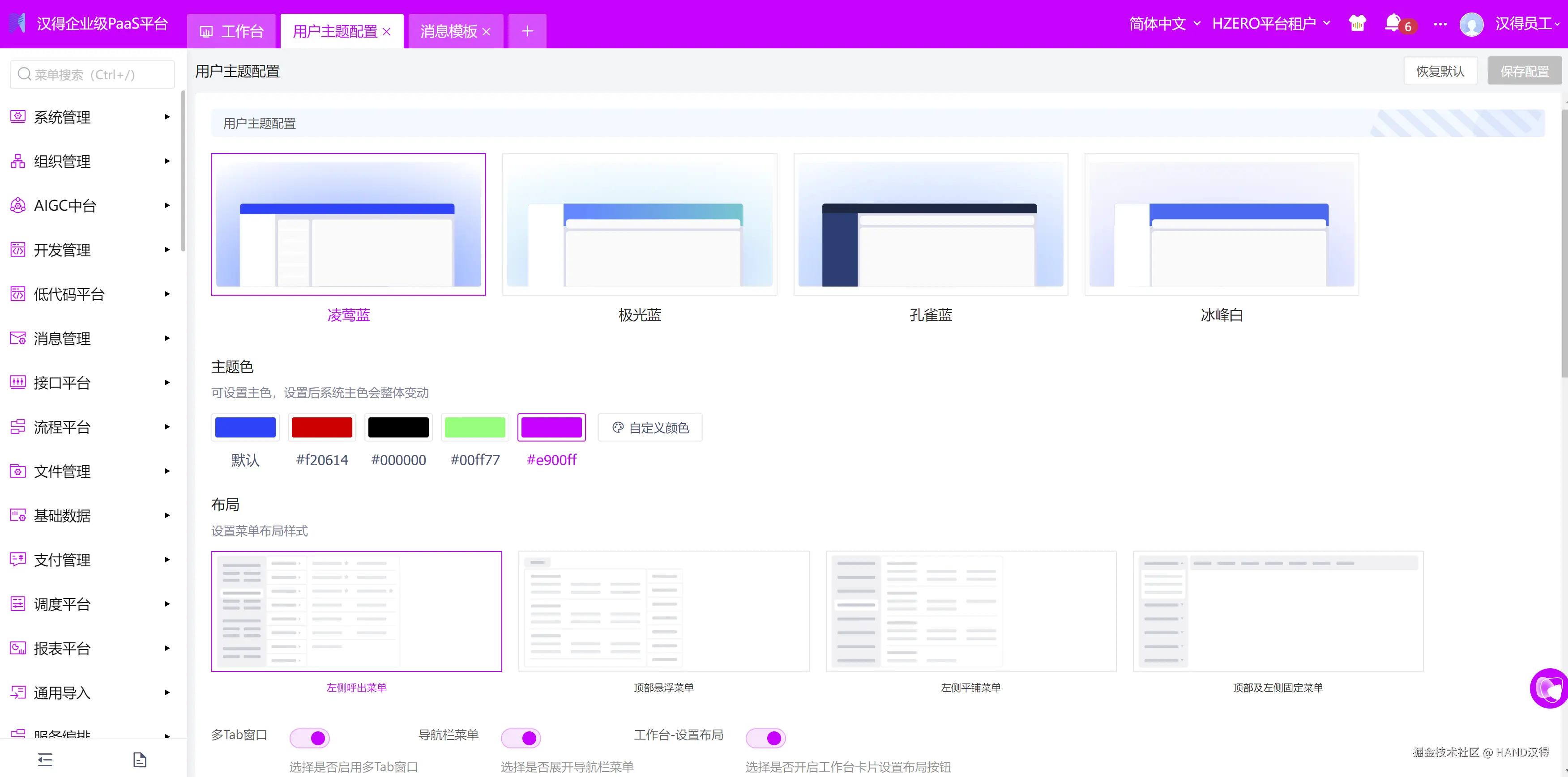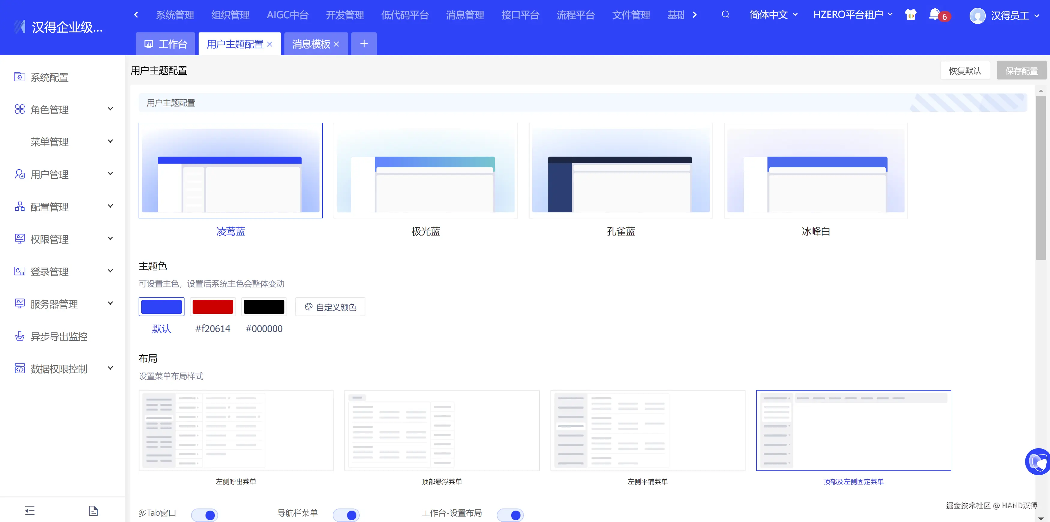 HZERO 平台预置了多套布局,在定制新主题的同时,也支持自定义布局,HZERO 平台提供了解决方案示例,让自定义布局实现更简单,同时也使得布局风格更适合自己的企业。