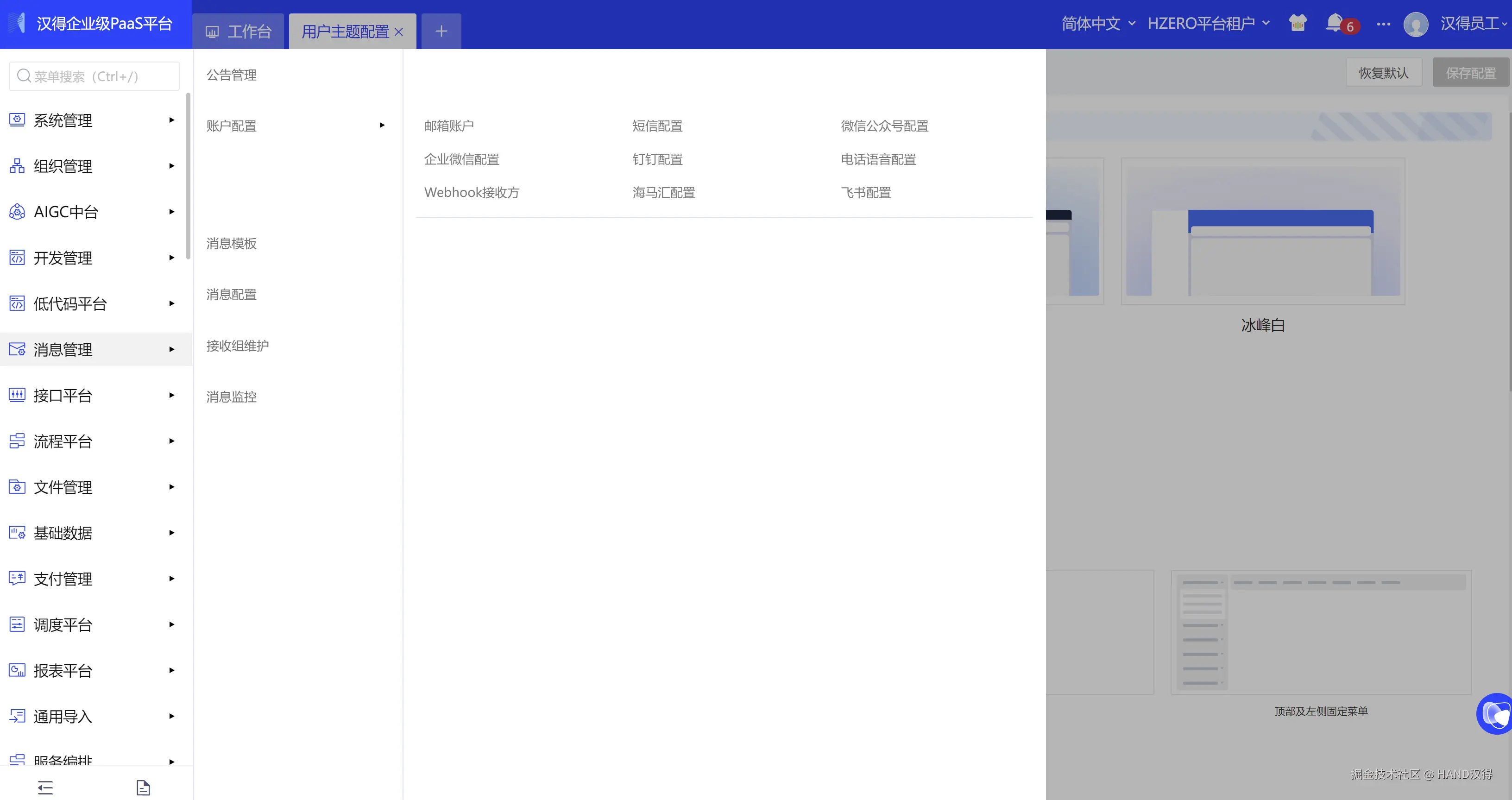 方案: HZERO 支持在平台级统一修改主题,然后由管理员关闭主题配置入口,做到全体用户体验一致。
