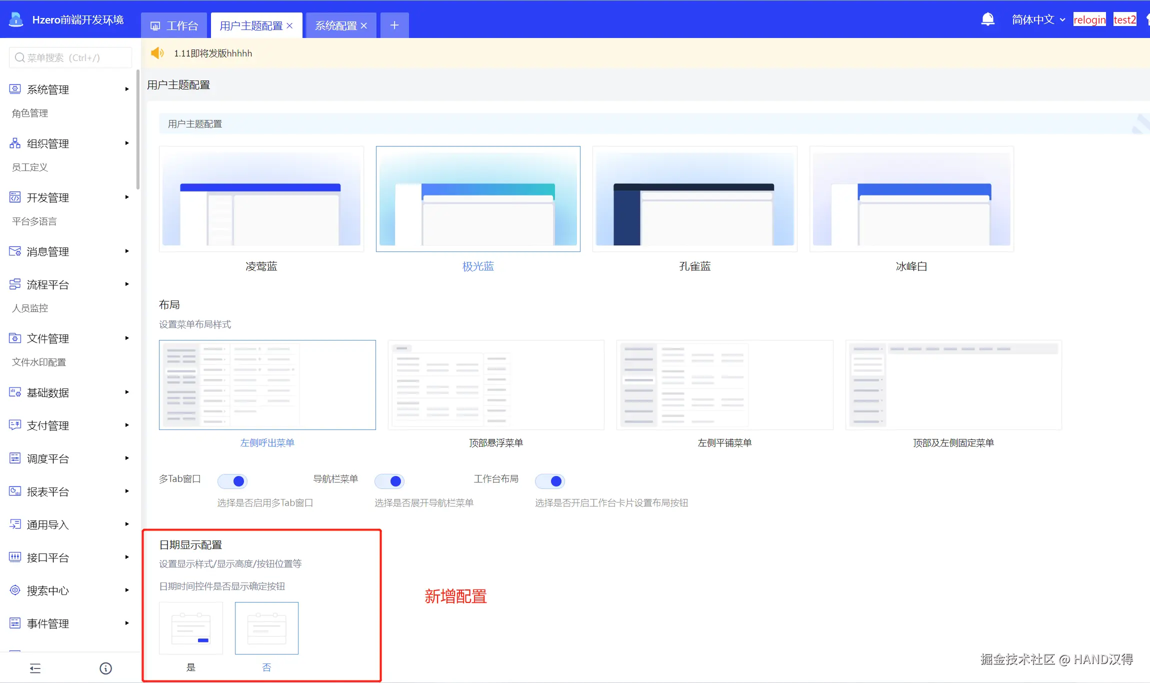 上述内容介绍了 HZERO 主题内置的多个配置项,对于想要支持更多配置的企业,HZERO 作为一个强大的开发平台,支持自定义开发新增配置。