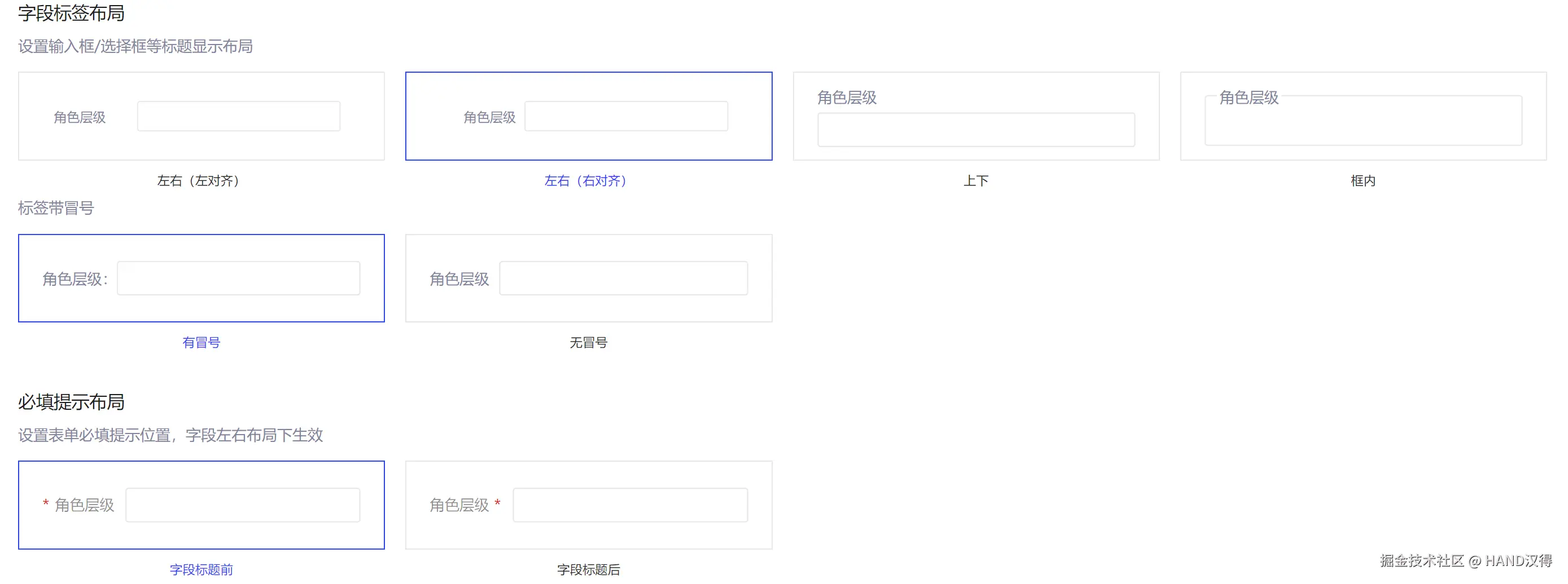 2. 表单相关配置: 表单作为数据录入的重要界面,支持了字段标签的多种显示方式,以及冒号、必填提示显示配置。