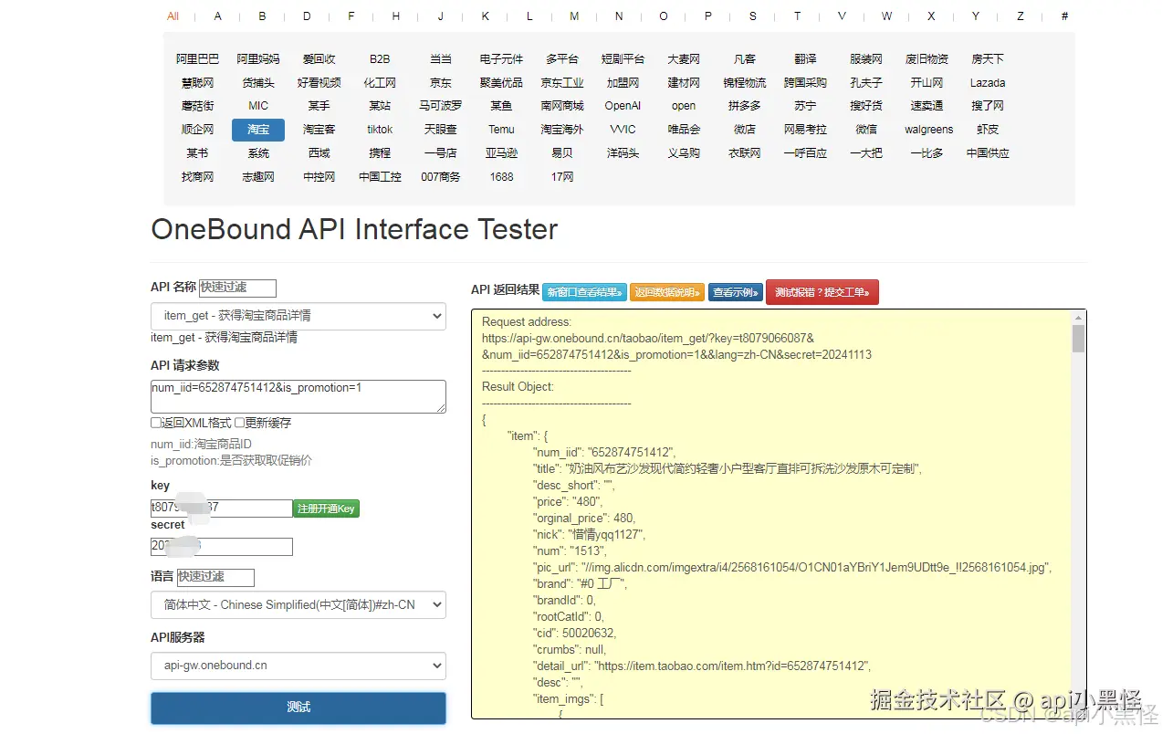 - 注册测试账号:首先,需要在万邦开放平台注册一个测试账号。这个账号通常用于访问API文档、获取测试密钥(key)和秘密(secret)等。