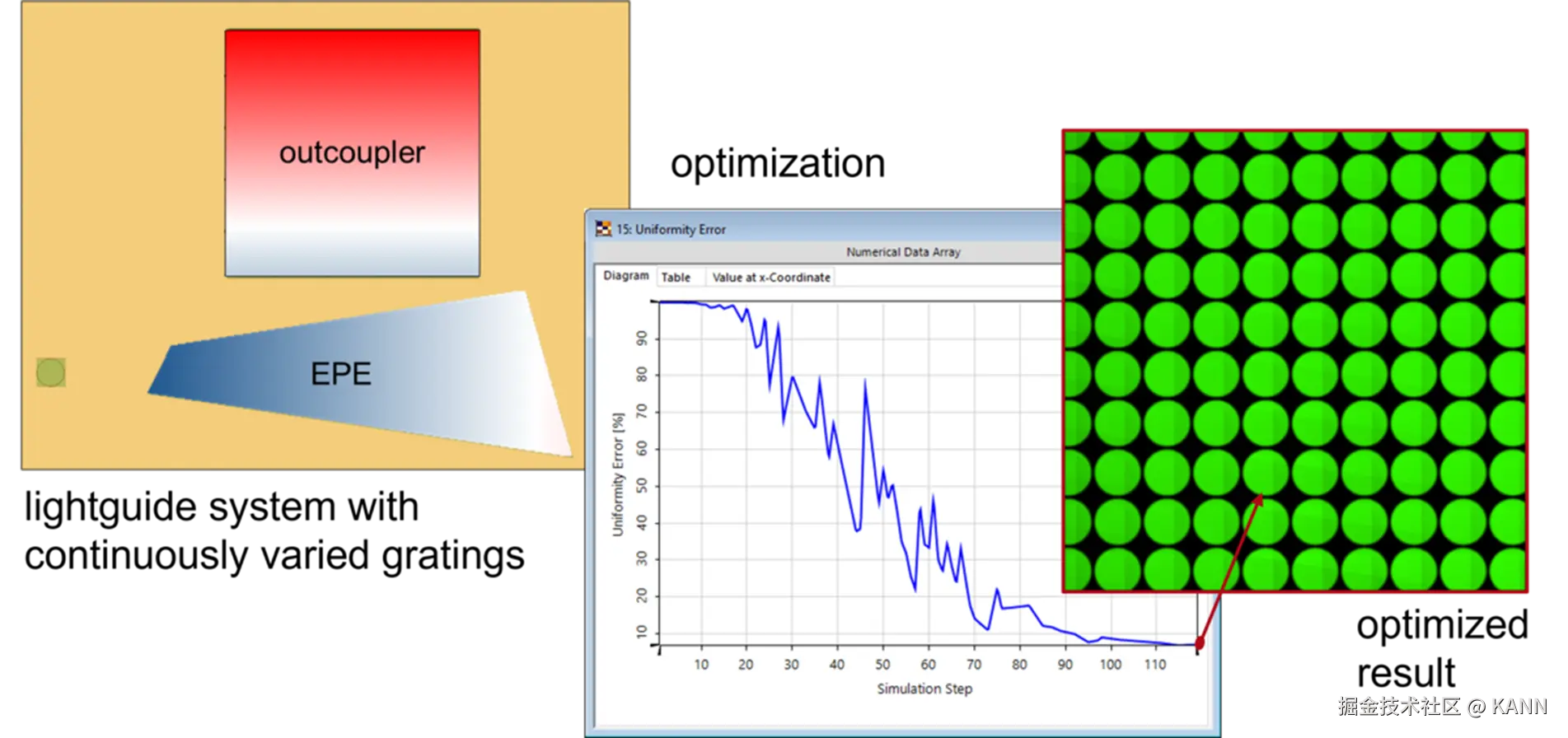 | 上次我们强调了快速物理光学软件VirtualLab Fusion分析光波导系统性能。这次我们在设计工作流程中处理一个密切相关的步骤: 在系统的耦合和扩展区域中使用的光栅几何结构的优化。 VirtualLab Fusion为这项任务提供了一系列强大的工具,如:可以计算基本优化函数(如均匀性和效率)的探测器,以及沿着布局的特定区域实现光栅参数平滑变化的可能性。后一种方法可大大减少优化中自由参数的数量,同时保证灵活性。要了解更多信息,请查看下面的示例! 连续调制光栅区域光波导的优化 |