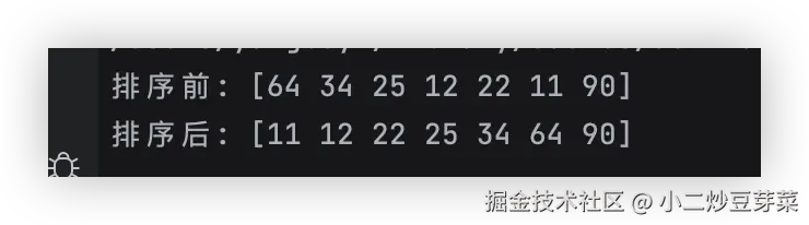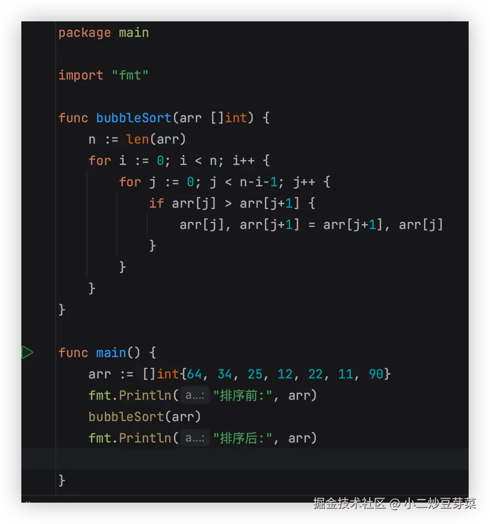 - 在外部循环中,我们使用一个内部循环for j := 0; j < n-i-1; j++来遍历当前未排序部分的每个相邻的两个元素,从第一个元素开始,直到倒数第二个元素。