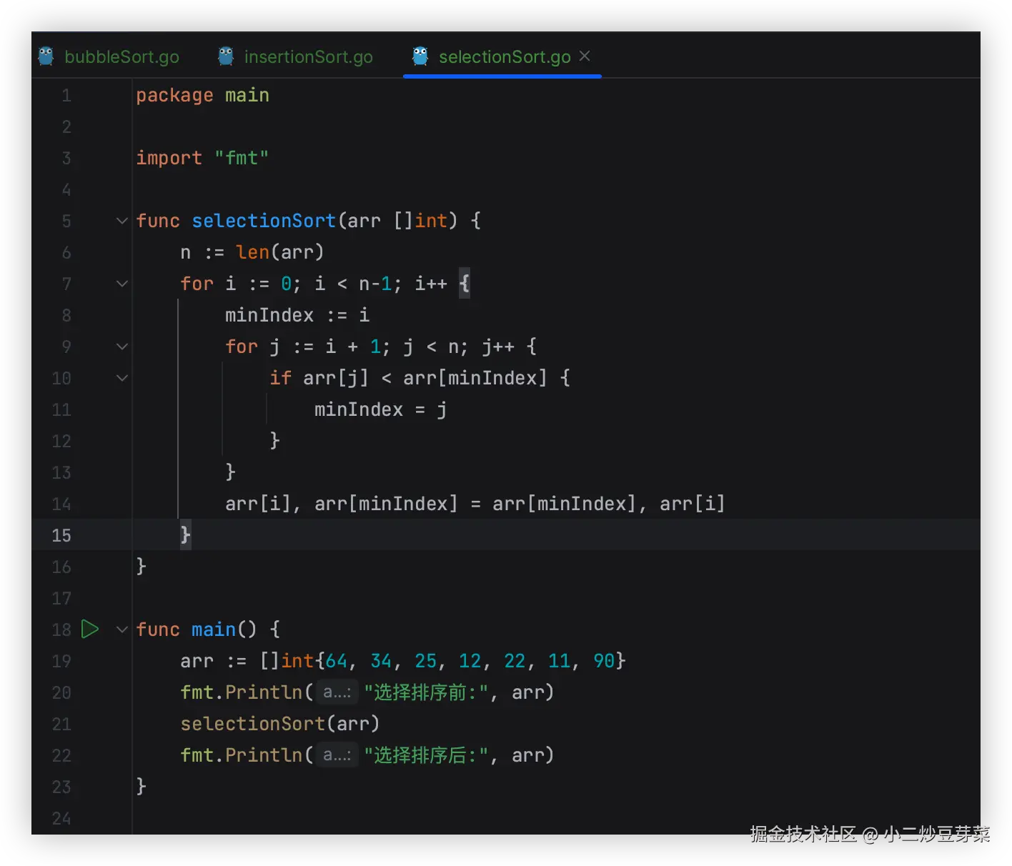 - 接下来,我们使用一个内部循环for j := i + 1; j < n; j++来遍历当前未排序部分的每个元素,从下一个元素开始,直到最后一个元素。