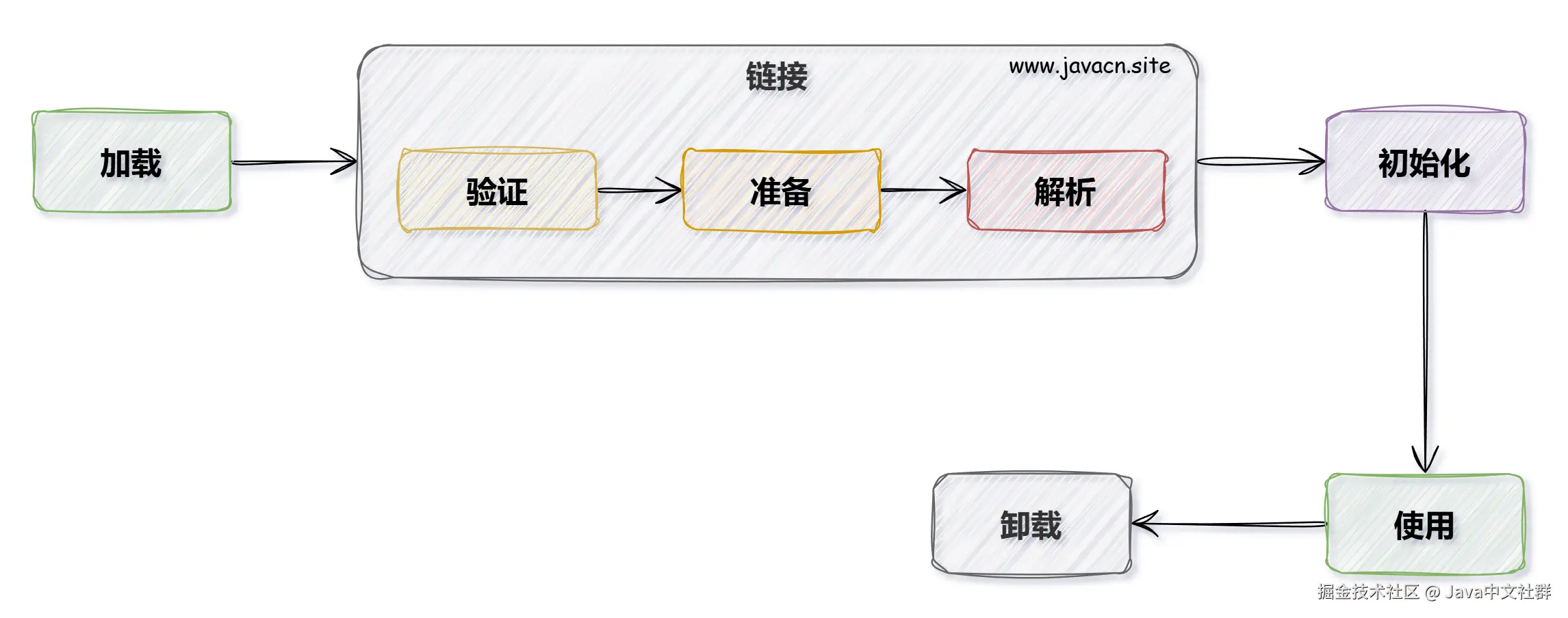我们知道在 JVM 中类加载总共使用 5 步组成的,而类的生命周期总共有 7 个阶段,如下图所示:
