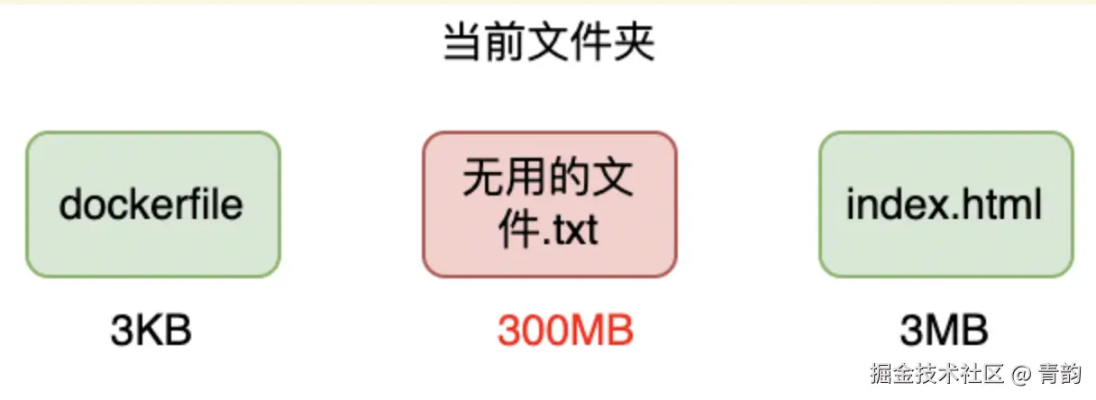 我们发现当前文件夹下,我们仅依赖dockerfile和index.html,有个dockerfile中没有用到的 “无用的文件”占用了300MB,如果这些都被打包发送给docker服务端,网络传输就要耗费很长时间,便会降低整体构建速度。