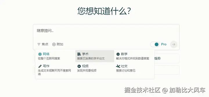 当你需要深入研究某一领域的信息时,Perplexity 的“专注”搜索功能非常有用。