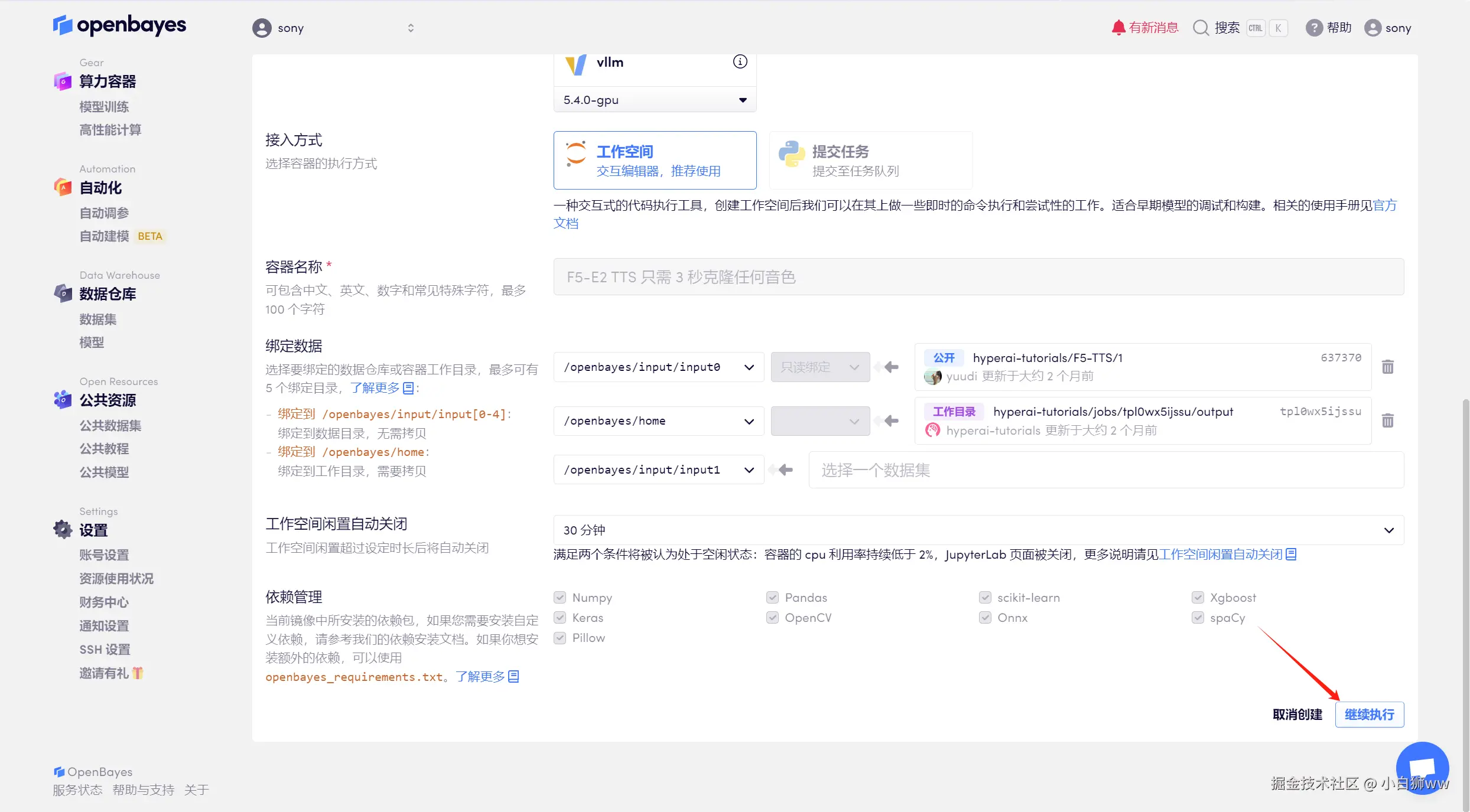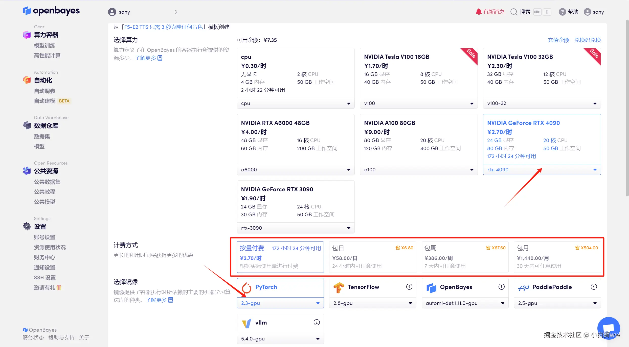 页面跳转后,选择「NVIDIA RTX 4090」以及「PyTorch」镜像,OpenBayes 平台上线了新的计费方式,大家可以按照需求选择「按量付费」或「包日/周/月」,点击「继续执行」。可以使用文章开头的邀请链接,获得 RTX 4090 使用时长!