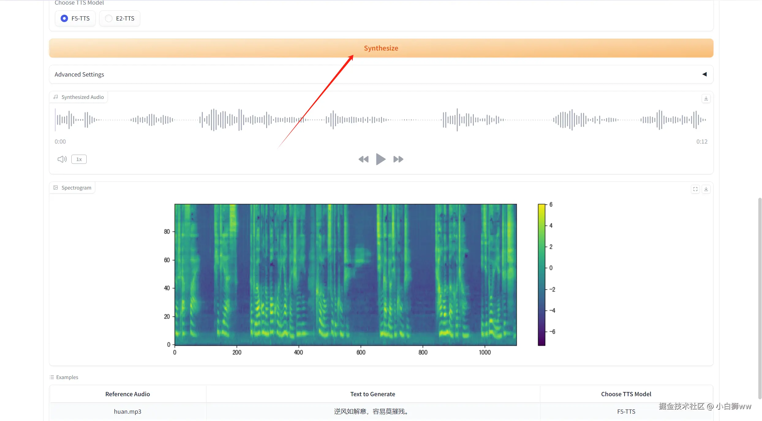 选择「TTS」,在「Reference Audio」处上传需要克隆的音频(例如:甄嬛的音频),在「Text to Generate」中输入文本提示词( F5-TTS 的主要功能包括零样本声音克隆、速度控制、情感表现控制、长文本合成以及多语言支持。)点击「Synthesize」提交。在「Advanced Settings」下可设置高级参数: