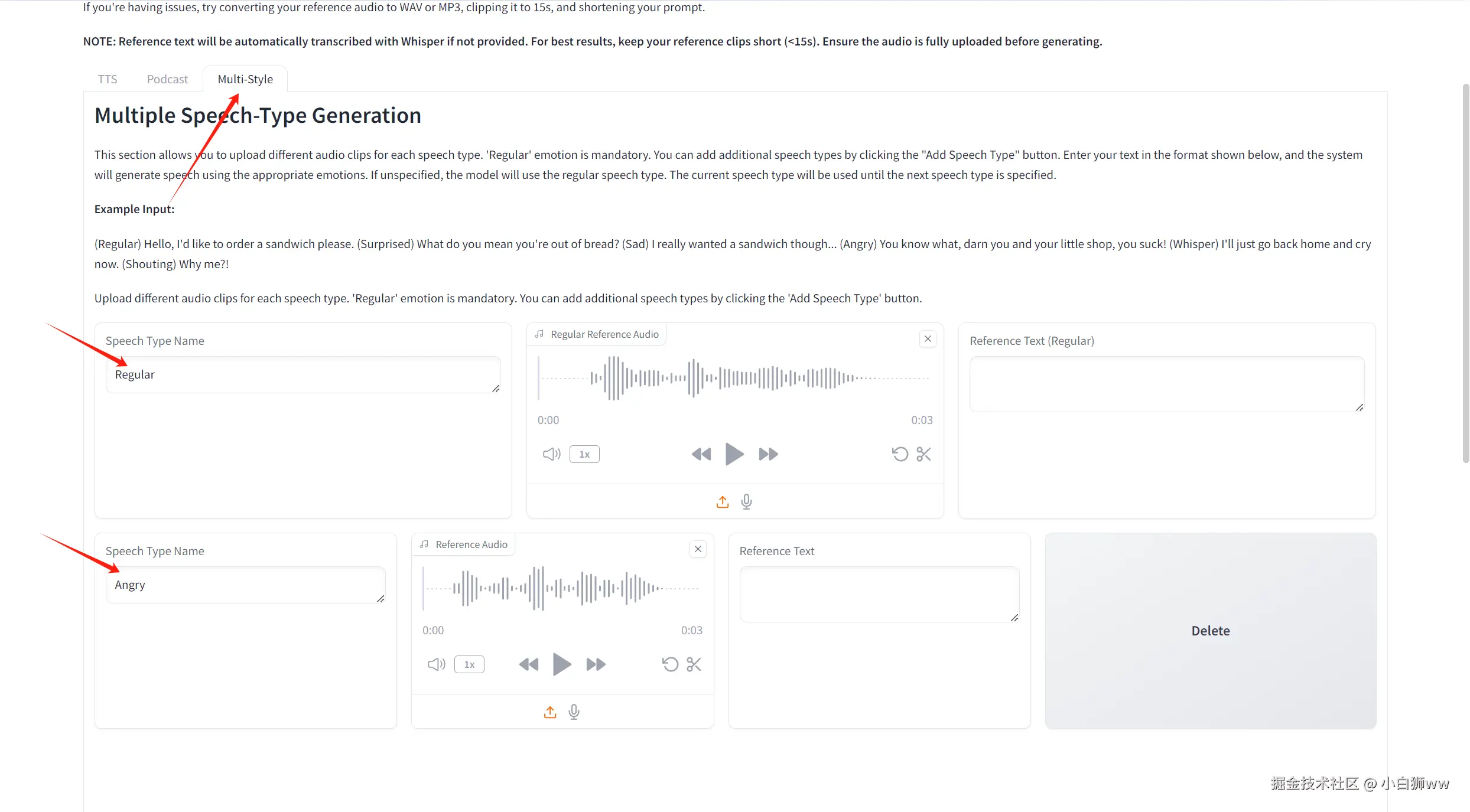 这个功能可以使用模型模拟情绪,根据不同的情绪进行音频生成。选择「Multiple Speech-Type Generation」后,点击「Add Speech Type」添加不同语气类型和音频(例如 Regular 和 Angry),在「Text to Generate」中按照要求的格式输入生成文本 (Angry:You know what, darn you and your little shop, you suck!) 然后选择模型 F5-TTS 或 E2-TTS。最后点击「Generate Emotional Speech」生成。