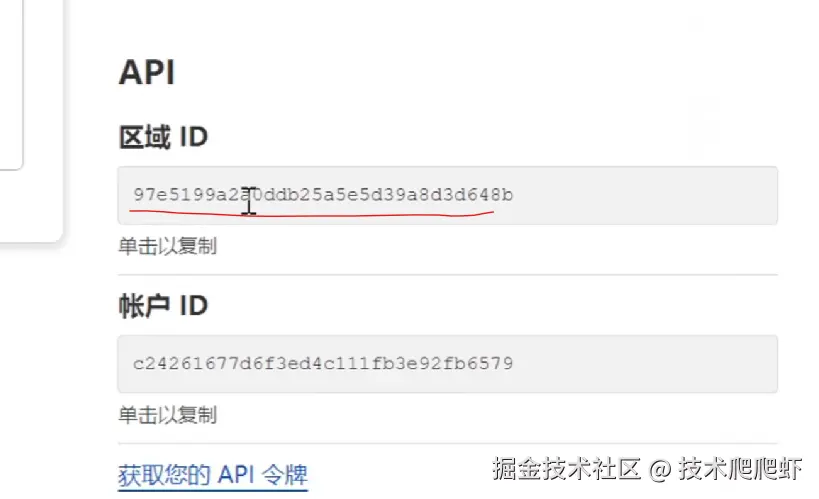 我们去Cloudflare官网去找这个区域ID,这里回到首页,找到我需要的那个域名tech-shrimp.com。右下角有一个API的区域ID,我把这个ID填写过来。