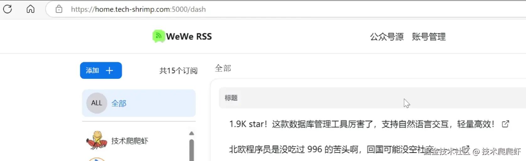 这是我经常用的一个订阅微信公众号为RSS链接的项目,然后它有一个内网地址,然后使用的是4,000端口。我在路由器这里配置了端口转发,也就是说,把我内网的地址代理到公网上,同样的使用4,000端口。