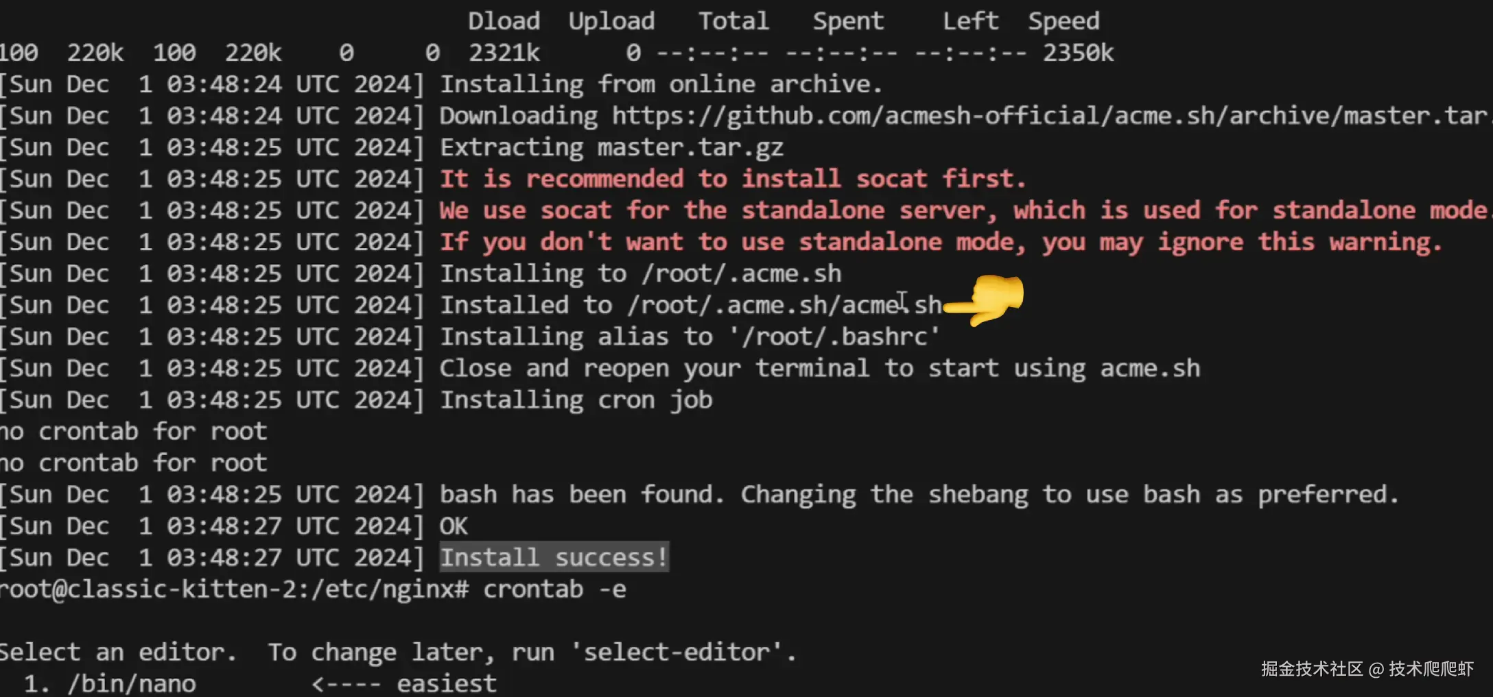 首先,这个-d这里要替换成自己的域名。这里我的域名是tech-shrimp.com。开头的acme.sh需要修改成完整路径。最后的webroot需要改一下,改成我们刚才查看的那个nginx配置。