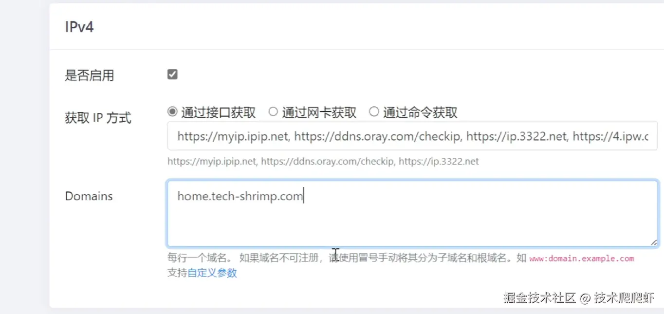 接下来把IPV4启用,然后我们填写一个域名,这个域名就可以直接指向我的家庭内网服务。这里域名叫home.tech-shrimp.com,然后我们保存一下。