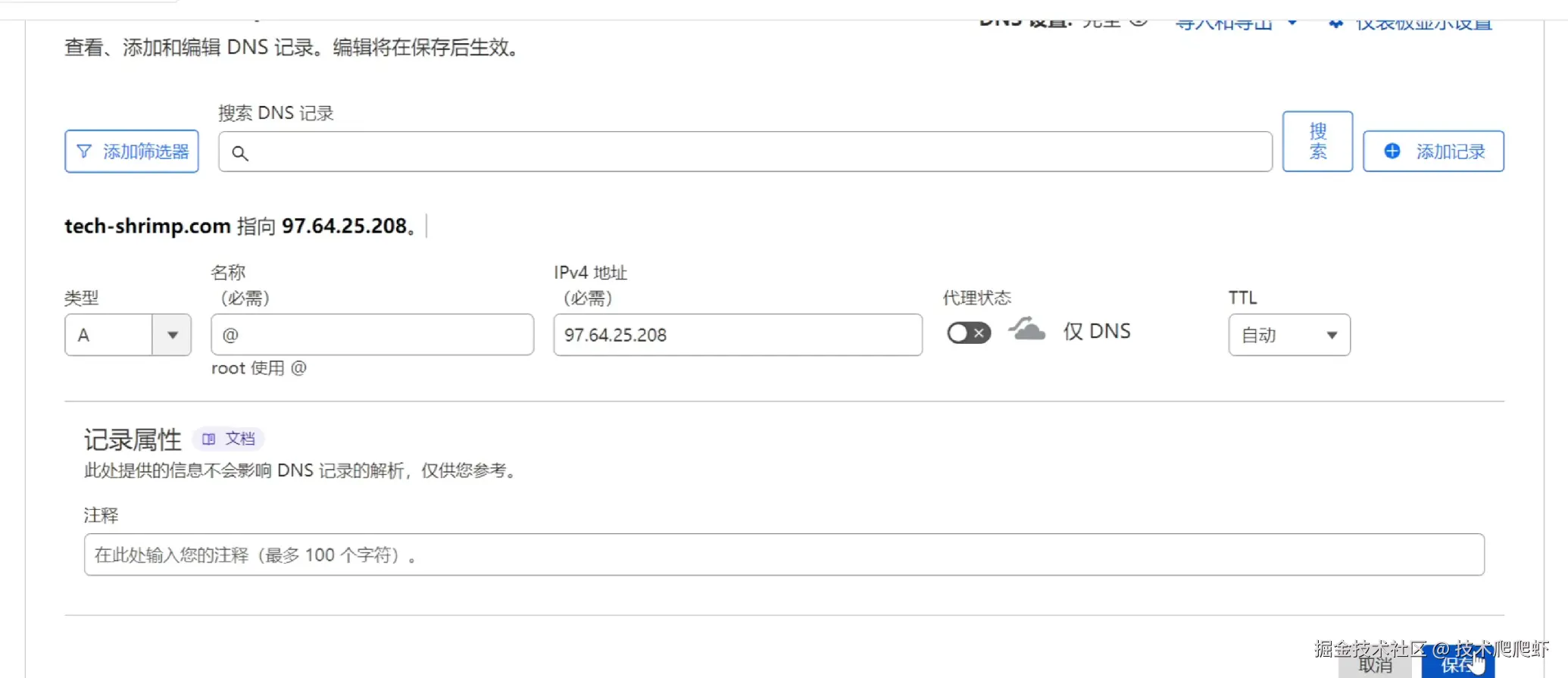 这里我准备了一个tech-shrimp.com的域名。爬爬虾之前视频里有介绍过如何低价获得一个域名或者申请免费的域名,这里我就不赘述了。我们拿到域名以后,在域名脱管网站添加一个DNS记录,把域名解析到我刚才的服务器上面。我把这个小黄云先关上,这里添加一个a类型的记录,名称填写@,IPV4地址填写我服务器的公网IP地址,然后点击保存。
