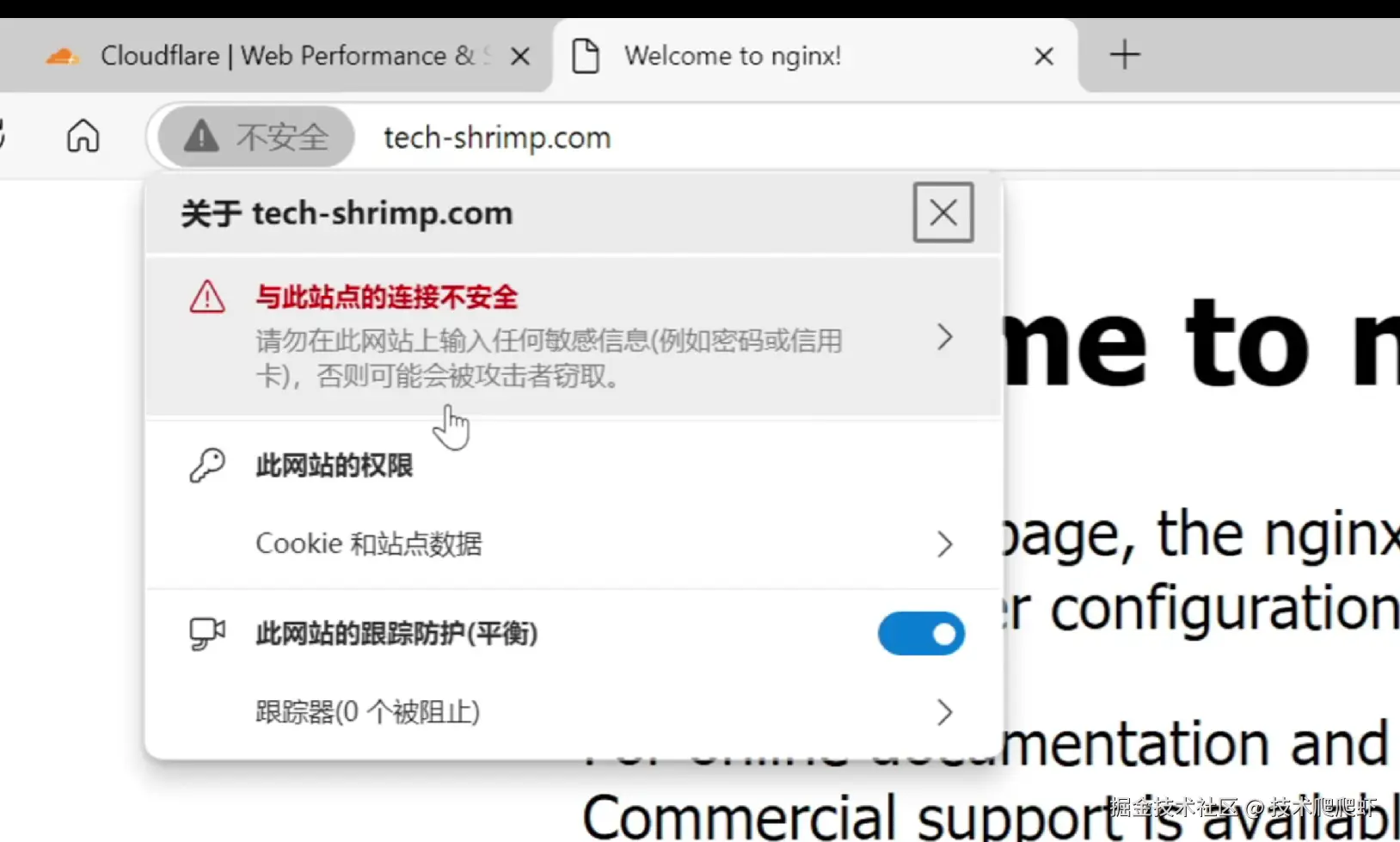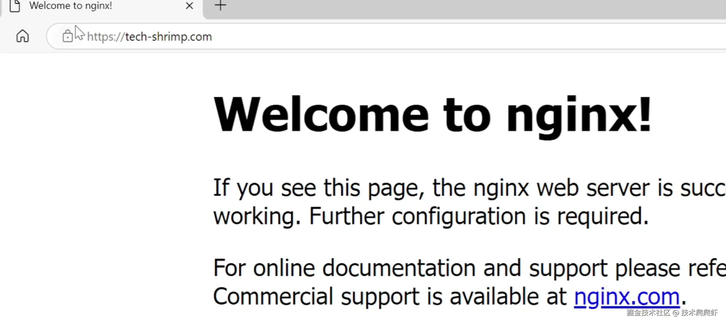 重启完成以后,我们访问一下我的域名tech-shrimp.com,这里可以使用https协议了,然后我们回车。可以看到现在就是一个安全的网站,