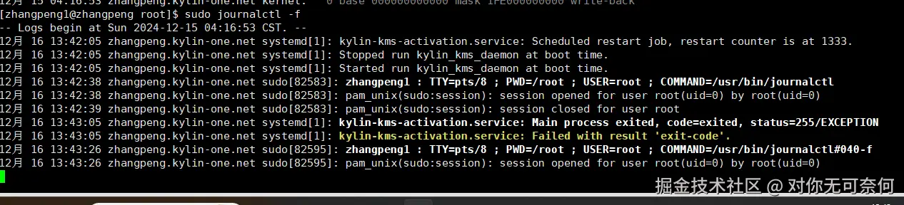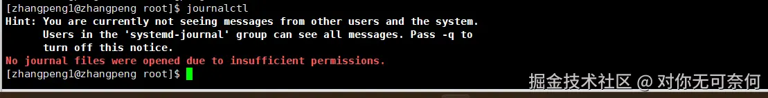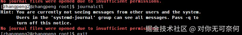 退出 zhangpeng2登录控制台并重新登录,执行journalctl命令