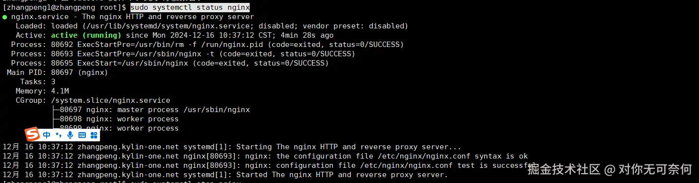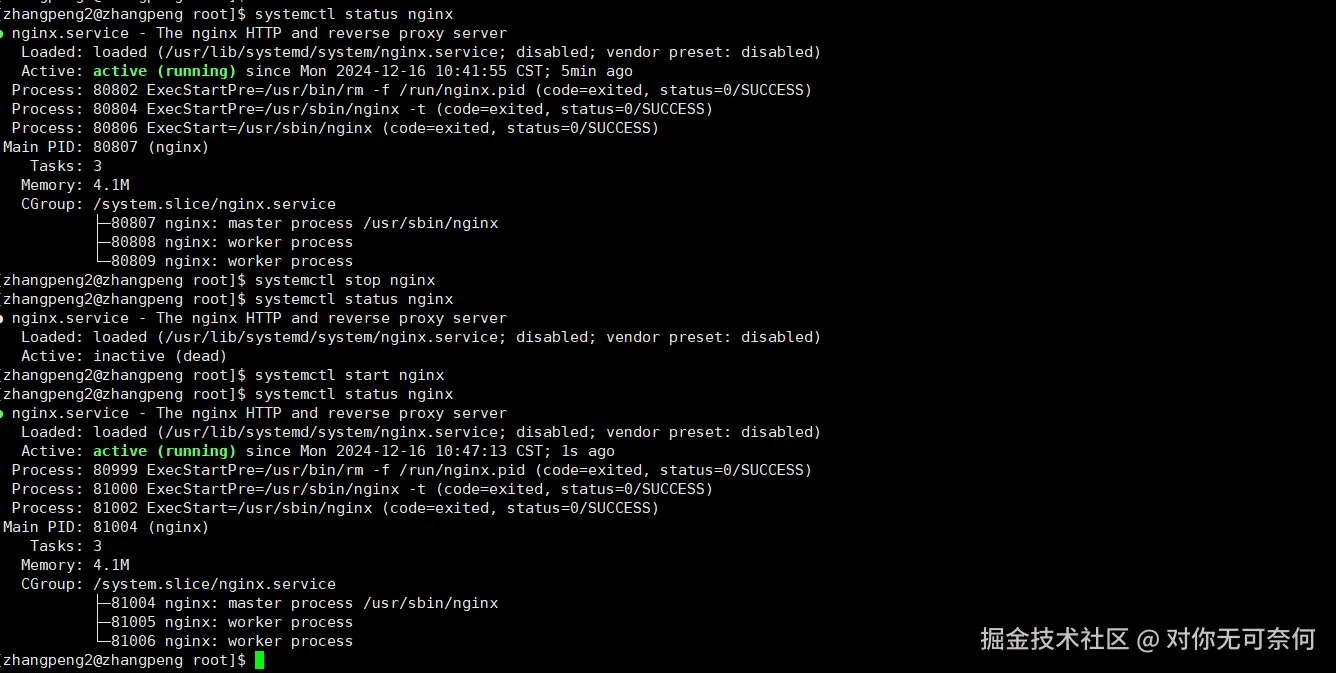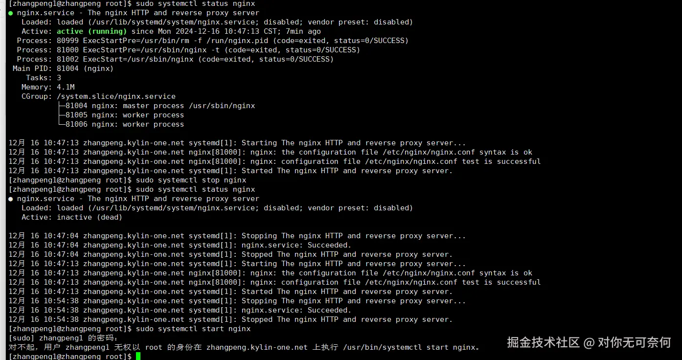 考虑到实际应用场景的需求,如普通用户 zhangpeng1 需要管理服务但没有 sudo 权限,我们可以采取以下措施:以nginx服务为例: