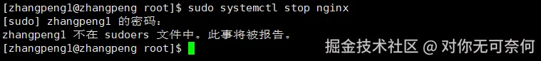 我们需要确保用户 zhangpeng1 仅能重启 nginx 服务,通过精确的 sudoers 文件配置可以实现这一要求: