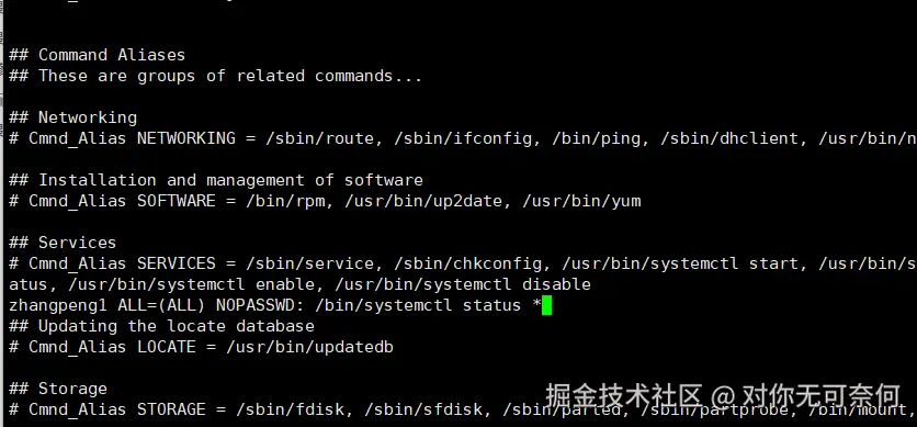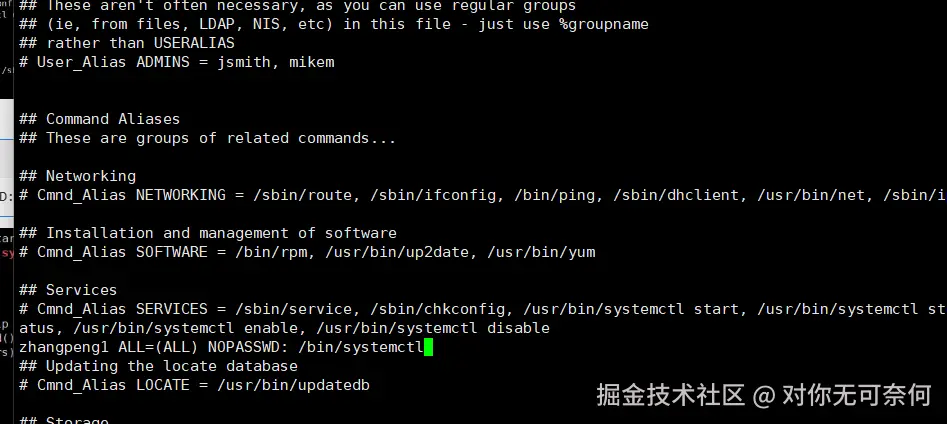 zhangpeng1 ALL=(ALL) NOPASSWD: /bin/systemctl