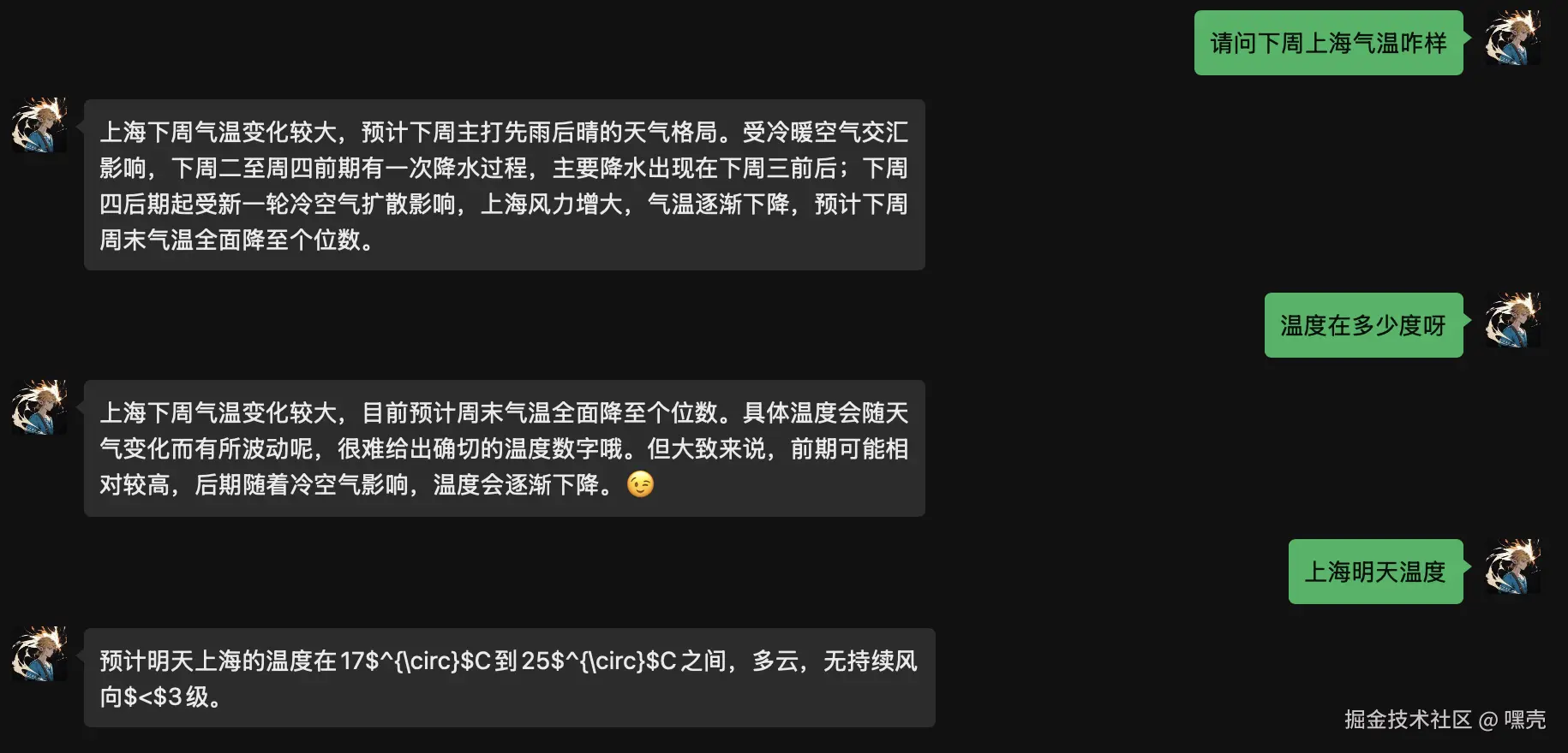 然后再问问天气,类似的问题智能体会自动调用bing搜索插件,不过感觉总结的不是很好,估计是 prompt 的原因。