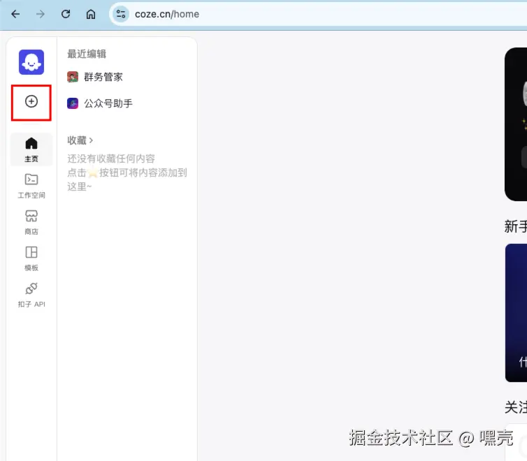 首先没账号的可以先去 https://www.coze.cn/ 注册一下,基础版账号就行,完成后进入主页面,点击左上角按钮即可开始创建智能体。