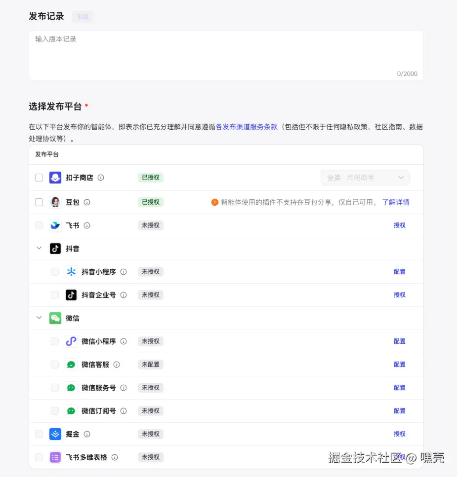 发布时 Coze 会默认勾选扣子商店,微信订阅号是无法勾选的,需要先点击后面的配置按钮,打开配置菜单,然后到 微信公众平台:mp.weixin.qq.com/ 进行配置。