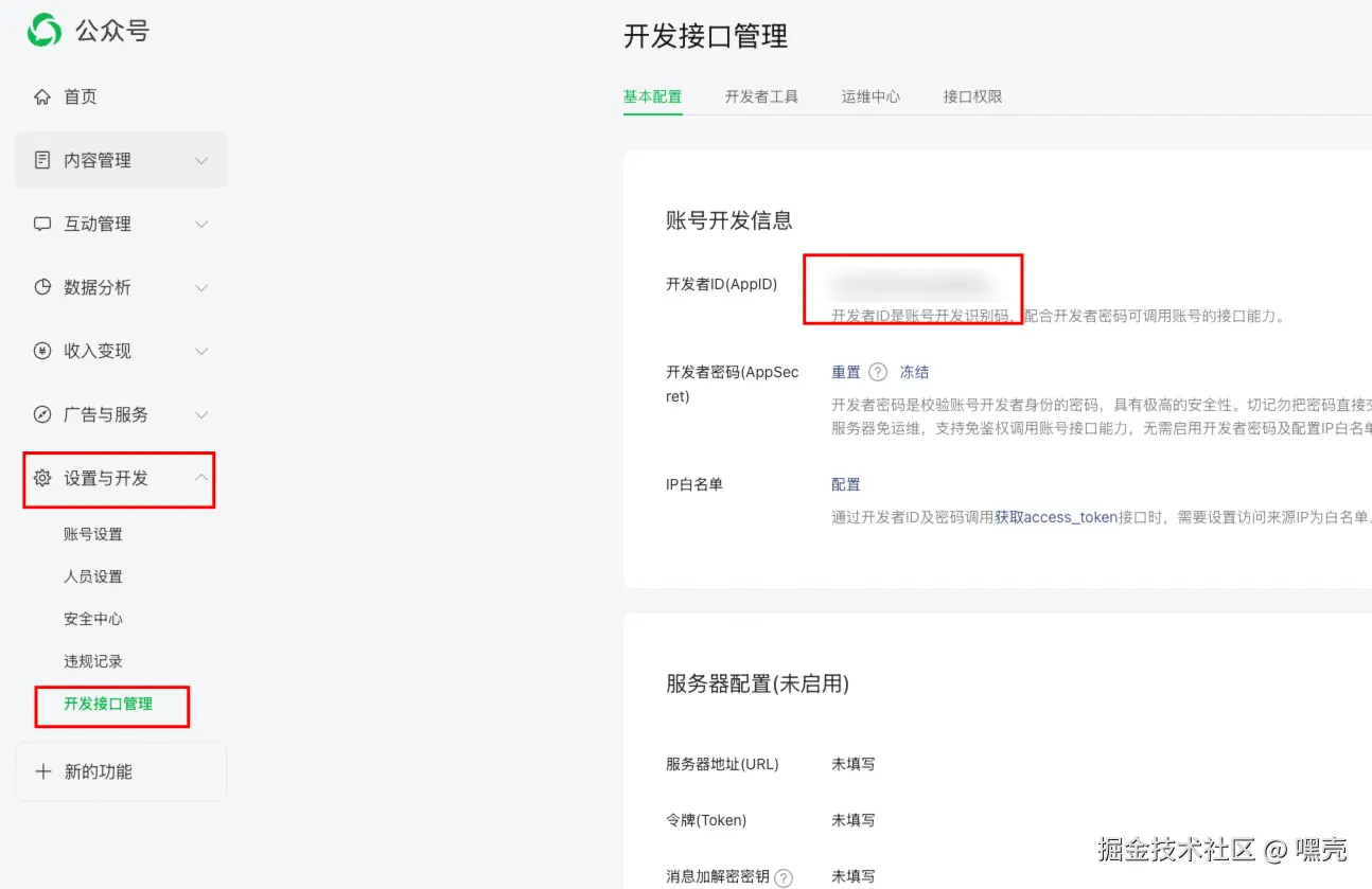 在设置与开发=》开发接口管理中找到开发者ID(AppID)并复制,如果没开通的话需要先开通一下。将 ID 粘贴到刚刚的弹窗中点击保存。扣子会进入授权页面,需要使用管理员微信扫码进行授权。授权完成后回到发布页面记得勾选微信订阅号平台再点击右上角发布。