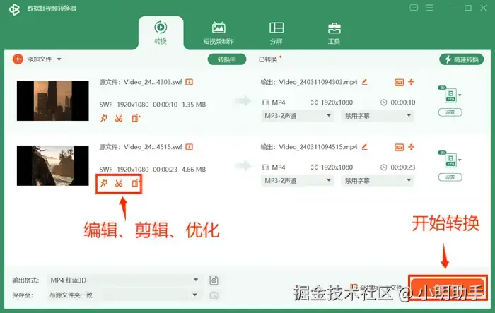 第四步: 我们还可以点击视频封面旁边的几个橙色图标对视频进行编辑、剪辑、优化等操作。完成所有的设置后,点击右下角的【全部转换】按钮,很快,SWF视频就能转换为MP4视频啦。