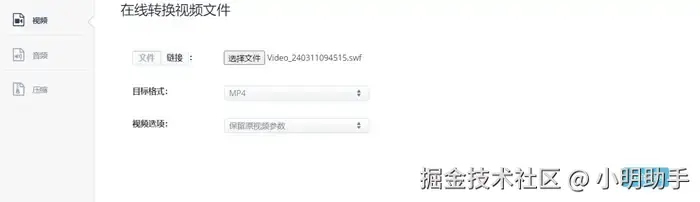 首先,小编要介绍的方法是:访问在线网站,通过使用在线网站的视频格式转换功能来进行转换。使用这种方法来进行格式转换非常便捷,只需要进入网站,在网站上传视频文件,选择格式为MP4格式,然后点击转换或者开始转换之类的按钮开始将swf转换为mp4格式,最后将MP4视频下载到电脑上即可。但使用在线网站上的格式转换功能一般会有文件大小以及网速限制,转换速度和质量都不太稳定。